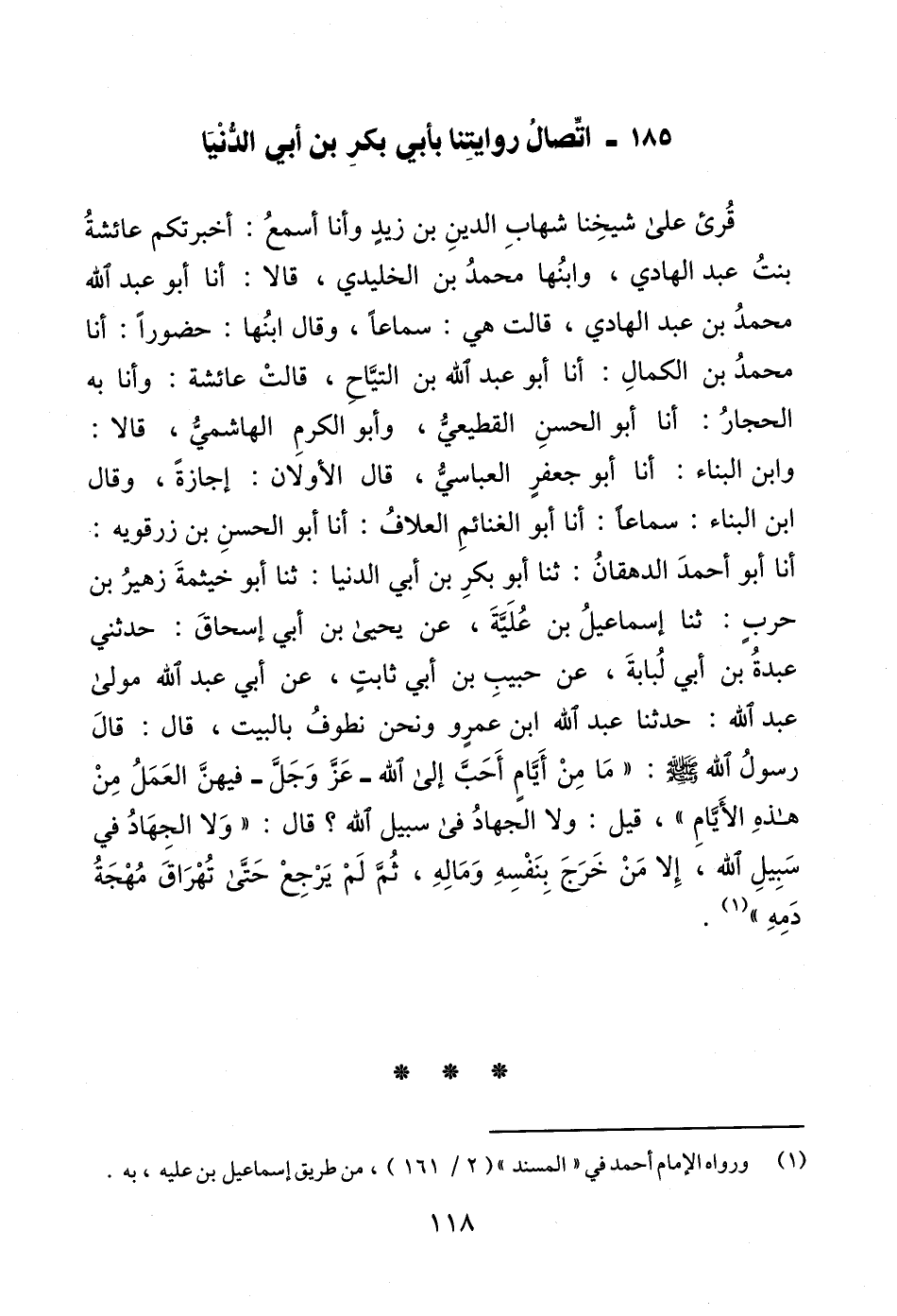 قُرئ على شيخِنا شهابِ الدينِ بن زيدٍ وأنا أسمعُ: أخبرتكم عائشةُ بنتُ عبد الهادي، وابنُها محمدُ بن الخليدي، قالا: أنا أبو عبد الله محمدُ بن عبد الهادي، قالت هي: سماعاً، وقال ابنُها: حضوراً: أنا محمدُ بن الكمالِ: أنا أبو عبد الله بن التيَّاحِ، قالتْ عائشة: وأنا به الحجارُ: أنا أبو الحسنِ القطيعيُّ، وأبو الكرمِ الهاشميُّ، قالا: وابن البناء: أنا أبو جعفرٍ العباسيُّ، قال الأولان: إجازةً، وقال ابن البناء: سماعا: أنا أبو الغنائمِ العلافُ: أنا أبو الحسنِ بن زرقويه: أنا أبو أحمدَ الدهقانُ: ثنا أبو بكرِ بن أبي الدنيا: ثنا أبو خيثمةَ زهيرُ بن حربٍ: ثنا إسماعيلُ بن عُلَيَّةَ، عن يحيى بن أبي إسحاقَ: حدثني عبدةُ بن أبي لُبابةَ، عن حبيبِ بن أبي ثابتٍ، عن أبي عبد الله مولى عبد الله: حدثنا عبد الله ابن عمرٍو ونحن نطوفُ بالبيت، قال: قالَ رسولُ الله - صلى الله عليه وسلم -: "مَا مِنْ أَيَّامٍ أَحَبَّ إلى الله -عَزَّ وَجَلَّ- فيهنَّ العَمَلُ مِنْ هذهِ الأَيَّامِ"، قيل: ولا الجهادُ فى سبيل الله؟ قال: "وَلا الجِهَادُ في سَبِيلِ الله، إِلا مَنْ خَرَجَ بِنَفْسِهِ وَمَالِهِ، ثُمَّ لَمْ يَرْجِعْ حَتَّى تُهْرَاقَ مُهْجَةُ دَمِهِ" (¬1).