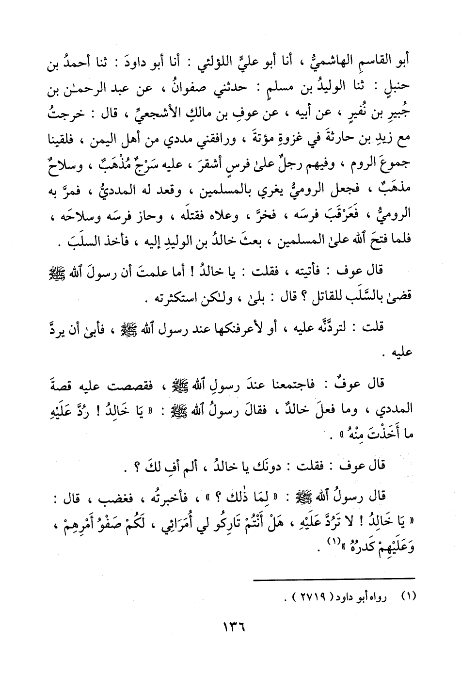 أبو القاسمِ الهاشميُّ، أنا أبو عليٍّ اللؤلئي: أنا أبو داودَ: ثنا أحمدُ بن حنبلٍ: ثنا الوليدُ بن مسلمٍ: حدثني صفوانُ، عن عبد الرحمن بن جُبيرِ بن نُفيير، عن أبيه، عن عوفِ بن ماللث الأشجعيِّ، قال: خرجتُ مع زيدِ بن حارثةَ في غزوةِ مؤتةَ، ورافقني مددي من أهل اليمن، فلقينا جموعَ الروم، وفيهم رجلٌ على فرسٍ أشقرَ، عليه سَرْجٌ مُذْهَبٌ، وسلاحٌ مذهَبٌ، فجعل الروميُّ يغري بالمسلمين، وقعد له المدديُّ، فمرَّ به الروميّ، فَعَرْقَبَ فرسَه، فخرَّ، وعلاه فقتلَه، وحاز فرسَه وسلاحَه، فلما فتحَ الله على المسلمين، بعثَ خالدُ بن الوليدِ إليه، فأخذ السلَبَ.