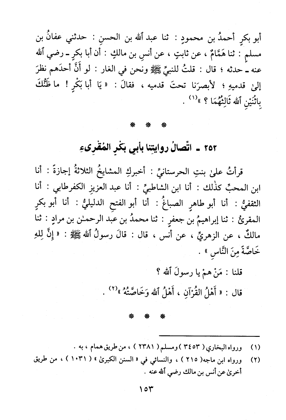 قرأتُ علي بنتِ الحرستانيِّ: أخبركِ المشايخُ الثلاثةُ إجازةً: أنا ابن المحبِّ كذلك: أنا ابن الشاطبيِّ: أنا عبد العزيزِ الكفرطابي: أنا الثقفيُّ: أنا أبو طاهرٍ الصباغُ: أنا أبو الفتحِ الدليليُّ: أنا أبو بكير المقرئُ: ثنا إبراهيمُ بن جعفرٍ: ثنا محمدُ بن عبد الرحمن بن مرادٍ: ثنا مالك، عن الزهريِّ، عن أنس، قال: قالَ رسولُ الله - صلى الله عليه وسلم -: "إِنَّ لِلهِ خَاصَّةً مِنَ النَّاسِ".
