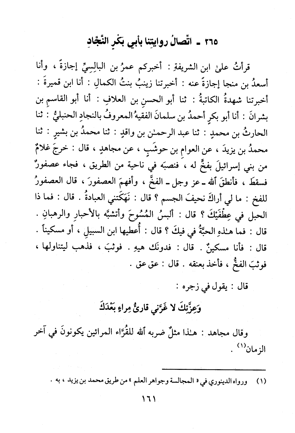 قرأتُ على ابن الشريفةِ: أخبركم عمرُ بن البالِسِيِّ إجازة، وأنا أسعدُ بن منجا إجازةً عنه: أخبرتنا زينبُ بنتُ الكمالِ: أنا ابن قميرةَ: أخبرتنا شهدةُ الكاتبةُ: ثنا أبو الحسنِ بن العلافِ: أنا أبو القاسمِ بن بشرانَ: أنا أبو بكير أحمدُ بن سلمانَ الفقيهُ المعروفُ بالنجادِ الحنبليُّ: ثنا الحارثُ بن محمل!: ثنا عبد الرحمن بن واقد: ثنا محمدُ بن بشيرٍ: ثنا محمدُ بن يزيدَ، عن العوامِ بن حوشَبٍ، عن مجاهدٍ، قال: خرجَ غلامٌ من بني إسرائيلَ بفخٍّ له، فنصبَه في ناحية من الطريق، فجاء عصفور فسقطَ، فأنطقَ الله -عَزَّ وَجَلَّ- الفخَّ، وأفهمَ العصفورَ، قال العصفورُ للفخ: ما لي أراكَ نحيفَ الجسم؟ قال: نَهَكَتني العبادةُ. قال: فماذا الحبل في عِطْفَيْكَ؟ قال: ألبسُ المُسُوحَ وأتشبَّه بالأحبارِ والرهبانِ. قال: فما هذهِ الحبَّةُ في فيكَ؟ قال: أُعطيها ابن السبيلِ، أو مسكيناً. قال: فأنا مسكينٌ. قال: فدونَك هيهِ. فوثبَ، فذهب ليتناولها، فوثبَ الفخُّ، فأخذ بعنقه. قال: عق عق.