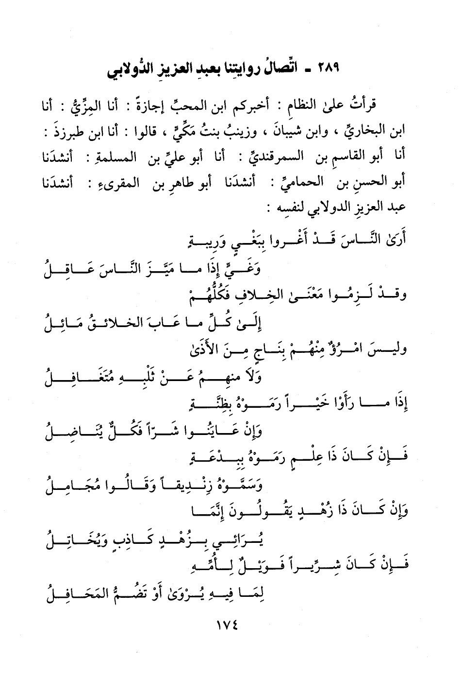 قرأتُ على النظامِ: أخبركم ابن المحبِّ إجازةً: أنا المِزِّيُّ: أنا ابن البخاريِّ، وابن شيبانَ، وزينبُ بنتُ مَكّي، قالوا: أنا ابن طبرزذَ: أنا أبو القاسمِ بن السمرقنديِّ: أنا أبو عليِّ بن المسلمةِ: أنشدَنا أبو الحسنِ بن الحماميِّ: أنشدَنا أبو طاهرِ بن المقرىءِ: أنشدَنا عبد العزيزِ الدولابي لنفسِه: