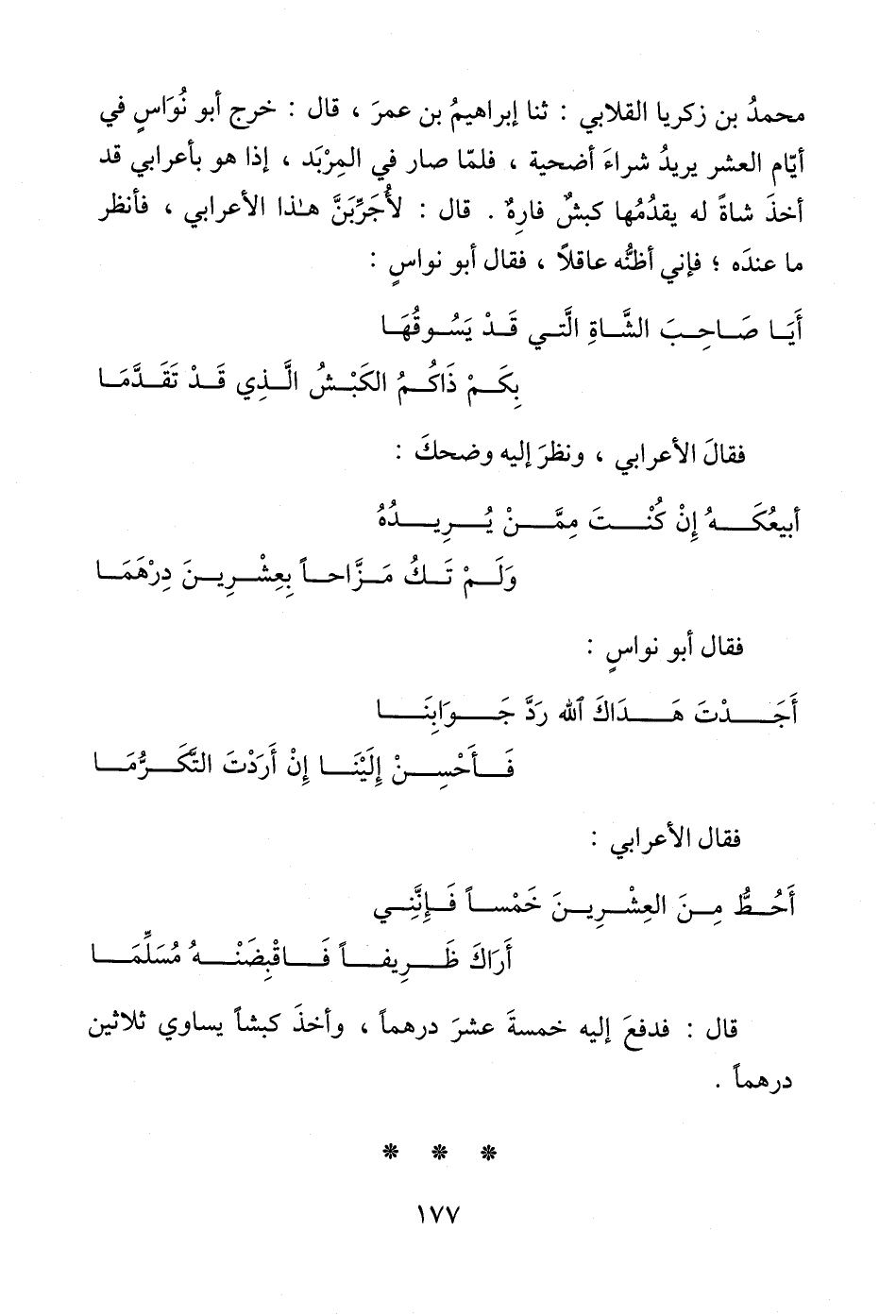 محمدُ بن زكريا القلابي: ثنا إبراهيمُ بن عمرَ، قال: خرج أبو نُوَاس في أيّام العشر يريدُ شراءَ أضحية، فلمّا صار في المِرْبَد، إذا هو بأعرابي قد أخذَ شاةً له يقدُمُها كبشٌ فارِهٌ. قال: لأُجَرِّبَنَّ هذا الأعرابي، فأنظر ما عندَه؛ فإني أظنُّه عاقلًا، فقال أبو نواسٍ: