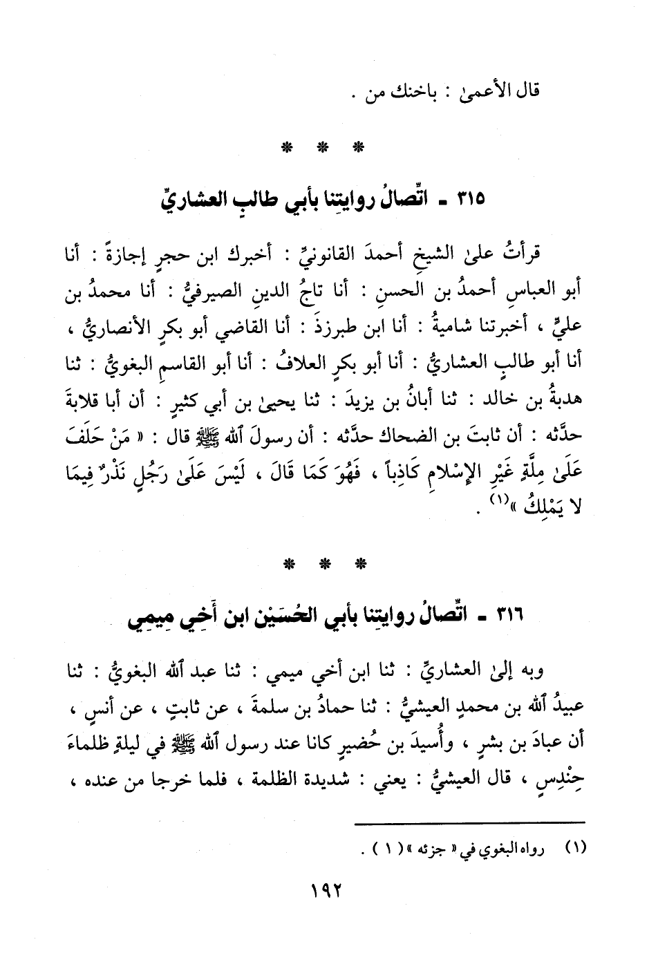 قرأتُ على الشيخِ أحمدَ القانونيِّ: أخبرك ابن حجرٍ إجازةً: أنا أبو العباسِ أحمدُ بن الحسنِ: أنا تاجُ الدينِ الصيرفيُّ: أنا محمدُ بن على، أخبرتنا شاميةُ: أنا ابن طبرزذَ: أنا القاضي أبو بكرٍ الأنصاريُّ، أنا أبو طالبٍ العشاريُّ: أنا أبو بكرٍ العلافُ: أنا أبو القاسمِ البغويُّ: ثنا هدبةُ بن خالد: ثنا أبانُ بن يزيدَ: ثنا يحيى بن أبي كثيرٍ: أن أبا قلابةَ حدَّثه: أن ثابتَ بن الضحاك حدَّثه: أن رسولَ الله - صلى الله عليه وسلم - قال: " مَنْ حَلَفَ عَلَى مِلَّةٍ غَيْرِ الإسْلامِ كَاذِبًا، فَهُوَ كَمَا قَالَ، لَيْسَ عَلَى رَجُلٍ نَذْرٌ فِيمَا لا يَمْلِكُ" (¬1).