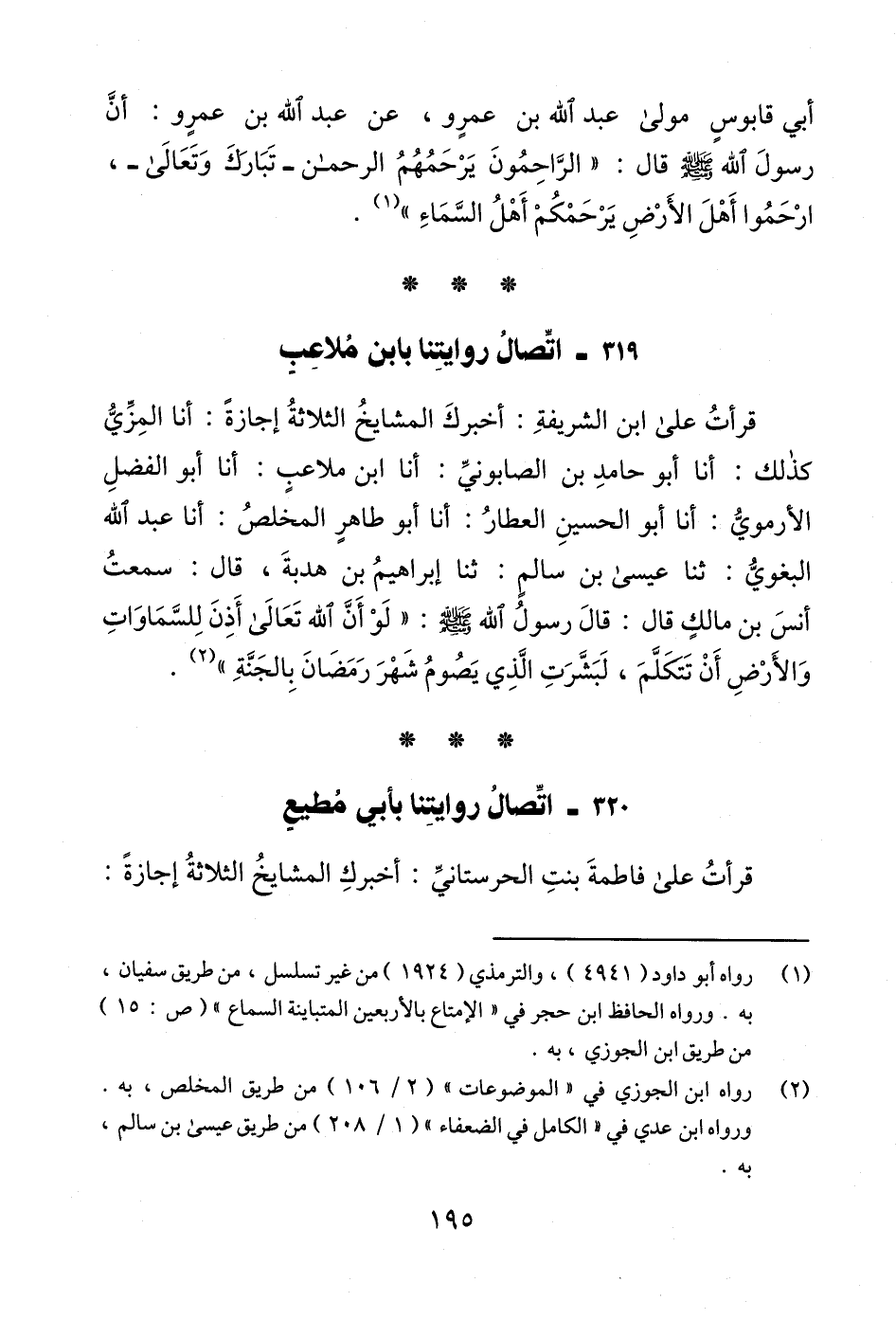 أبي قابوسٍ مولى عبد الله بن عميرو، عن عبد الله بن عمرٍو: أنَّ رسولَ الله - صلى الله عليه وسلم - قال: "الرَّاحِمُونَ يَرْحَمُهُمُ الرحمن -تَبَارَكَ وَتَعَالَى-، ارْحَمُوا أَهْلَ الأَرْضِ يَرْحَمْكُمْ أَهْلُ السَّمَاءِ" (¬1).