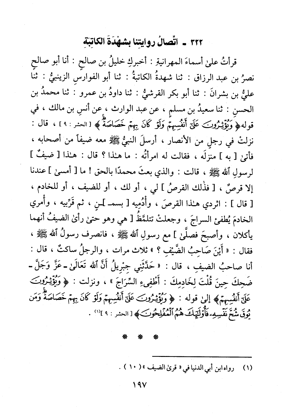 قرأتُ على أسماءَ المهرانيةِ: أخبركِ خليلُ بن صالحٍ: أنا أبو صالحٍ نصرُ بن عبد الرزاق: ثنا شهدةُ الكاتبةُ: ثنا أبو الفوارسِ الزينبيُّ: ثنا عليُّ بن بشرانَ: ثنا أبو بكر القرشيُّ: ثنا داودُ بن عمرو: ثنا محمدُ بن الحسنِ: ثنا سعيدُ بن مسليم، عن عبد الوارث، عن أنسِ بن مالك، في قوله {وَيُؤْثِرُونَ عَلَى أَنْفُسِهِمْ وَلَوْ كَانَ بِهِمْ خَصَاصَةٌ} [الحشر: 9]، قال: نزلتْ في رجلٍ من الأنصار، أرسلَ النبيُّ - صلى الله عليه وسلم - معه ضيفًا من أصحابه، فأتى [به] منزلَه، فقالت له امرأتُه: ما هذا؟ قال: هذا [ضيفٌ]، لرسولِ الله - صلى الله عليه وسلم -، قالت: والذي بعثَ محمدًا بالحق! ما [أمسى] عندنا إلا قرصٌ، [فذلك القرصُ] لي، أو لك، أو للضيف، أو للخادم، [قال]: اثردي هذا القرصَ، وأْدُمِيه [بسمـ]ـنٍ، ثم قَرِّبيه، وأْمري الخادمَ يُطفئ السراجَ، وجعلتْ تتلمَّظُ [هي وهو حتى رأى الضيفُ أنهما يأكلان، وأصبحَ فصلَّى] مع رسولِ الله - صلى الله عليه وسلم -، فانصرف رسولُ الله - صلى الله عليه وسلم -، فقال: "أَيْنَ صَاحِبُ الضَّيْفِ؟ " ثلاث مرات، والرجلُ ساكتٌ، قال: أنا صاحبُ الضيفِ، قال: "حَدَّثَنِي جِبْرِيلُ أَنَّ الله تَعَالَى -عَزَّ وَجَلَّ- ضَحِكَ حِينَ قُلْتَ لِخَادِمِكَ: أَطْفِىءِ السِّرَاجَ"، ونزلت: {وَيُؤْثِرُونَ عَلَى أَنْفُسِهِمْ} إلى قوله: {وَيُؤْثِرُونَ عَلَى أَنْفُسِهِمْ وَلَوْ كَانَ بِهِمْ خَصَاصَةٌ وَمَنْ يُوقَ شُحَّ نَفْسِهِ فَأُولَئِكَ هُمُ الْمُفْلِحُونَ} [الحشر: 9] (¬1).