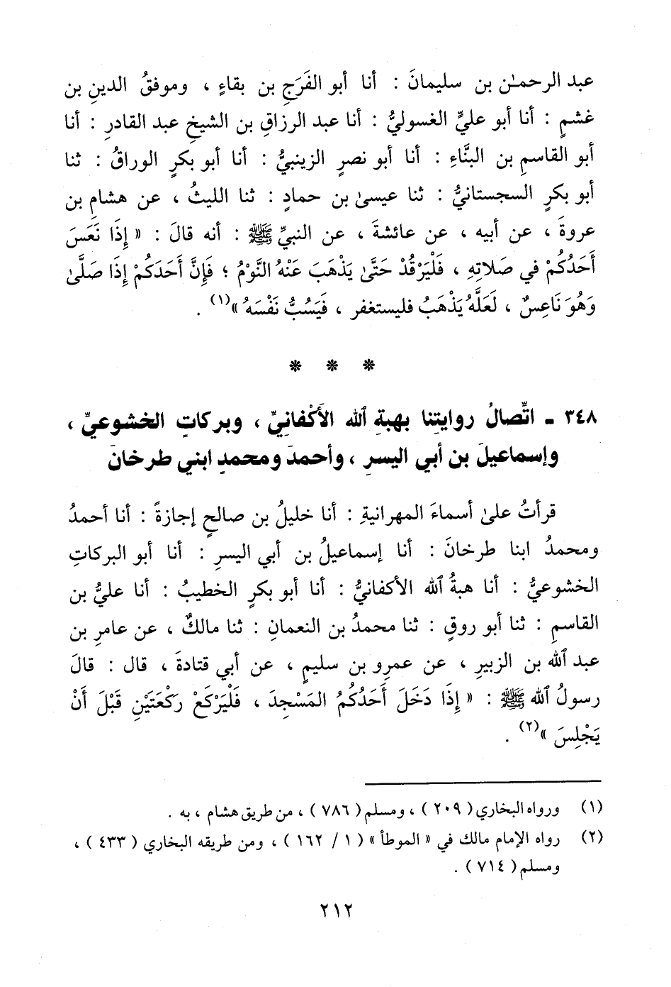 قرأتُ على أسماءَ المهرانيةِ: أنا خليلُ بن صالحٍ إجازةً: أنا أحمدُ ومحمدُ ابنا طرخانَ: أنا إسماعيلُ بن أبي اليسرِ: أنا أبو البركاتِ الخشوعيُّ: أنا هبةُ الله الأكفانيُّ: أنا أبو بكرٍ الخطيبُ: أنا عليُّ بن القاسمِ: ثنا أبو روقٍ: ثنا محمدُ بن النعمانِ: ثنا مالكٌ، عن عامرِ بن عبد الله بن الزبيرِ، عن عمرِو بن سليمٍ، عن أبي قتادةَ، قال: قالَ رسولُ الله - صلى الله عليه وسلم -: "إِذَا دَخَلَ أَحَدُكُمُ المَسْجدَ، فَلْيَرْكَعْ ركْعَتَيْنِ قَبْلَ أَنْ يَجْلِسَ" (¬2).