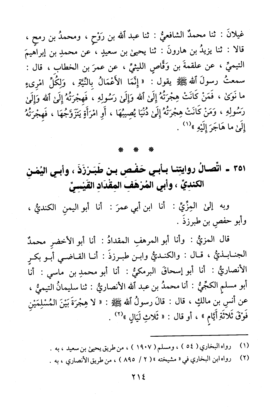 غيلانَ: ثنا محمدٌ الشافعيُّ: ثنا عبد الله بن رَوْحٍ، ومحمدُ بن رمحٍ، قالا: ثنا يزيدُ بن هارونَ: ثنا يحيى بن سعيدٍ، عن محمدِ بن إبراهيمَ التيميِّ، عن علقمةَ بن وَقَّاصٍ الليثيِّ، عن عمرَ بن الخطابِ، قال: سمعتُ رسولَ الله - صلى الله عليه وسلم - يقول: "إِنَّمَا الأَعْمَالُ بِالنِّيَّةِ، وَلِكُلِّ امْرِىءٍ ما نَوَى، فَمَنْ كَانَتْ هِجْرَتُهُ إِلَى الله وَإِلَى رَسُولِهِ، فَهِجْرَتُهُ إِلَى الله وَإِلَى رَسُولِهِ، وَمَنْ كَانَتْ هِجْرَتُهُ إِلَى دُنْيَا يُصِيبُهَا، أَوِ امْرَأَةٍ يَتَزَوَّجُهَا، فَهِجْرَتُهُ إِلَى ما هَاجَرَ إِلَيهِ" (¬1).