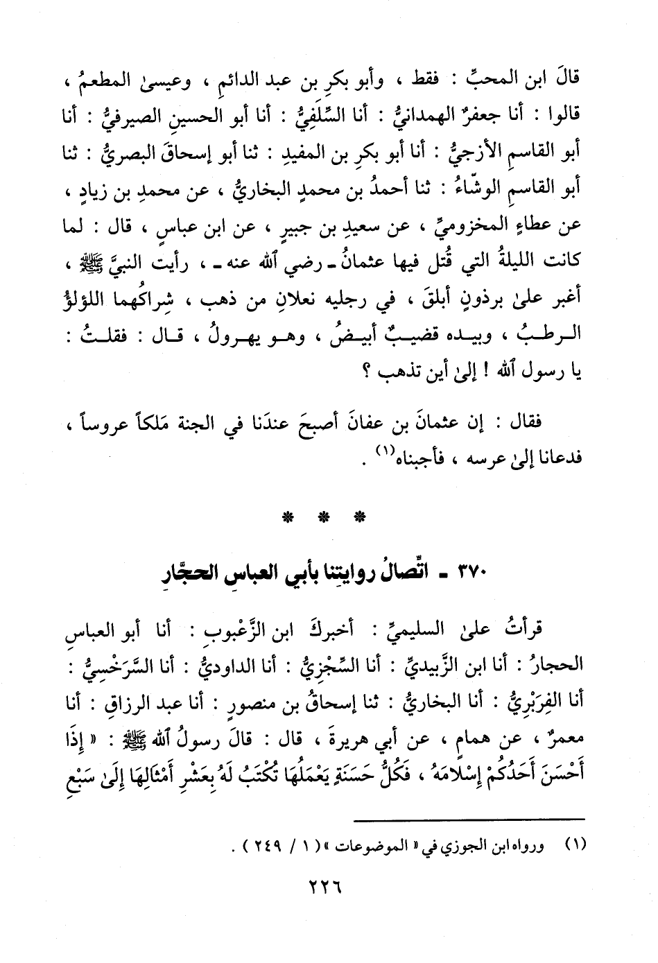 قالَ ابن المحبِّ: فقط، وأبو بكرِ بن عبد الدائمِ، وعيسى المطعمُ، قالوا: أنا جعفر الهمدانيُّ: أنا السِّلَفِيُّ: أنا أبو الحسينِ الصيرفيُّ: أنا أبو القاسمِ الأزجيُّ: أنا أبو بكرِ بن المفيدِ: ثنا أبو إسحاقَ البصريُّ: ثنا أبو القاسمِ الوشّاءُ: ثنا أحمدُ بن محمدٍ البخاريُّ، عن محمدِ بن زيادٍ، عن عطاءٍ المخزوميِّ، عن سعيدِ بن جبيرٍ، عن ابن عباسٍ، قال: لما كانت الليلةُ التي قُتل فيها عثمانُ -رضي الله عنه-، رأيت النبيَّ - صلى الله عليه وسلم -، أغبر على برذونٍ أبلقَ، في رجليه نعلانِ من ذهب، شِراكُهما اللؤلؤُ الرطبُ، وبيده قضيبٌ أبيضُ، وهو يهرولُ، قال: فقلتُ: يا رسول الله! إلى أين تذهب؟