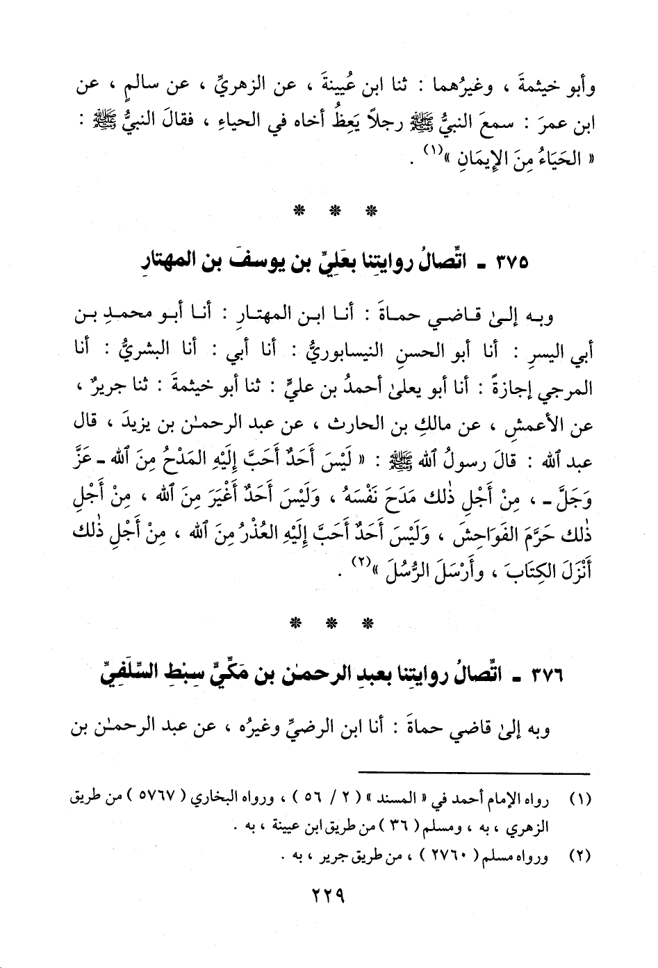 وبه إلى قاضي حماةَ: أنا ابن المهتارِ: أنا أبو محمدِ بن أبي اليسرِ: أنا أبو الحسنِ النيسابوريُّ: أنا أبي: أنا البشريُّ: أنا المرجي إجازةً: أنا أبو يعلى أحمدُ بن عليٍّ: ثنا أبو خيثمةَ: ثنا جريرٌ، عن الأعمشِ، عن مالكِ بن الحارث، عن عبد الرحمن بن يزيدَ، قال عبد الله: قالَ رسولُ الله - صلى الله عليه وسلم -: "لَيْسَ أَحَدٌ أَحَبَّ إِلَيْهِ المَدْحُ مِنَ الله -عَزَّ وَجَلَّ-، مِنْ أَجْلِ ذلك مَدَحَ نَفْسَهُ، وَلَيْسَ أَحَدٌ أَغْيَرَ مِنَ الله، مِنْ أَجْلِ ذلك حَرَّمَ الفَوَاحِشَ، وَلَيْسَ أَحَدٌ أَحَبَّ إِلَيْهِ العُذْرُ مِنَ الله، مِنْ أَجْلِ ذلك أَنْزَلَ الكِتَابَ، وأَرْسَلَ الرُّسُلَ" (¬2).