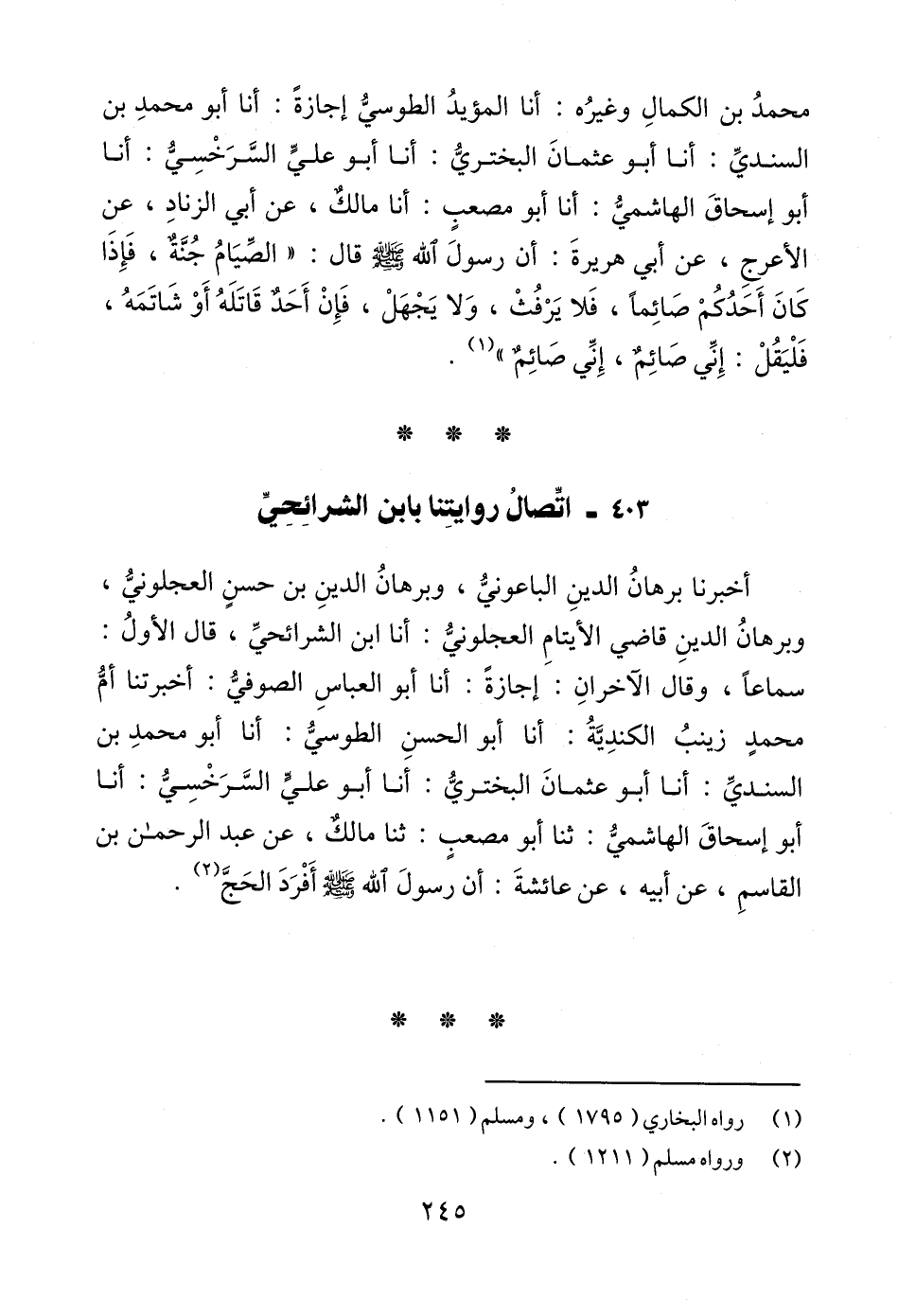 أخبرنا برهانُ الدينِ الباعونيُّ، وبرهانُ الدينِ بن حسنٍ العجلونيُّ، وبرهانُ الدينِ قاضي الأيتامِ العجلونيُّ: أنا ابن الشرائحيِّ، قال الأولُ: سماعًا، وقال الآخرانِ: إجازةً: أنا أبو العباسِ الصوفيُّ: أخبرتنا أمُّ محمدٍ زينبُ الكندِيَّةُ: أنا أبو الحسنِ الطوسيُّ: أنا أبو محمدِ بن السنديِّ: أنا أبو عثمانَ البختريُّ: أنا أبو عليٍّ السَّرَخْسِيُّ: أنا أبو إسحاقَ الهاشميُّ: ثنا أبو مصعب: ثنا مالكٌ، عن عبد الرحمن بن القاسمِ، عن أبيه، عن عائشةَ: أن رسولَ الله - صلى الله عليه وسلم - أَفْرَدَ الحَجَّ (¬2).