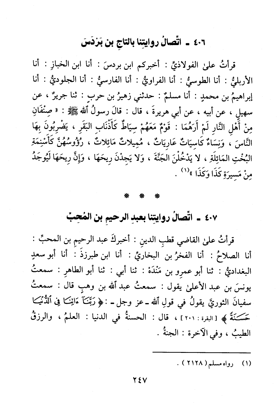 قرأتُ على الفولاذيِّ: أخبركم ابن بردسَ: أنا ابن الخبازِ: أنا الأربليُّ: أنا الطوسيُّ: أنا الفراويُّ: أنا الفارسيُّ: أنا الجلوديُّ: أنا إبراهيمُ بن محمدٍ: أنا مسلمٌ: حدثني زهيرُ بن حربٍ: ثنا جريرٌ، عن سهيلٍ، عن أبيه، عن أبي هريرةَ، قال: قالَ رسولُ الله - صلى الله عليه وسلم -: "صِنْفَانِ مِنْ أَهْلِ النَّارِ لَمْ أَرَهُمَا: قَوْمٌ مَعَهُمْ سِيَاطٌ كَأَذْنَابِ البَقَرِ، يَضْرِبُونَ بِهَا النَّاسَ، وَنِسَاءٌ كَاسِيَاتٌ عَارِيَاتٌ، مُمِيلاتٌ مَائِلاتٌ، رُؤُوسُهُنَّ كَأَسْنِمَةِ البُخْتِ المَائِلَةِ، لا يَدْخُلْنَ الجَنَّةَ، وَلا يَجِدْنَ رِيحَهَا، وَإِنَّ رِيحَهَا لَيُوجَدُ مِنْ مَسِيرَةِ كَذَا وَكَذَا" (¬1).