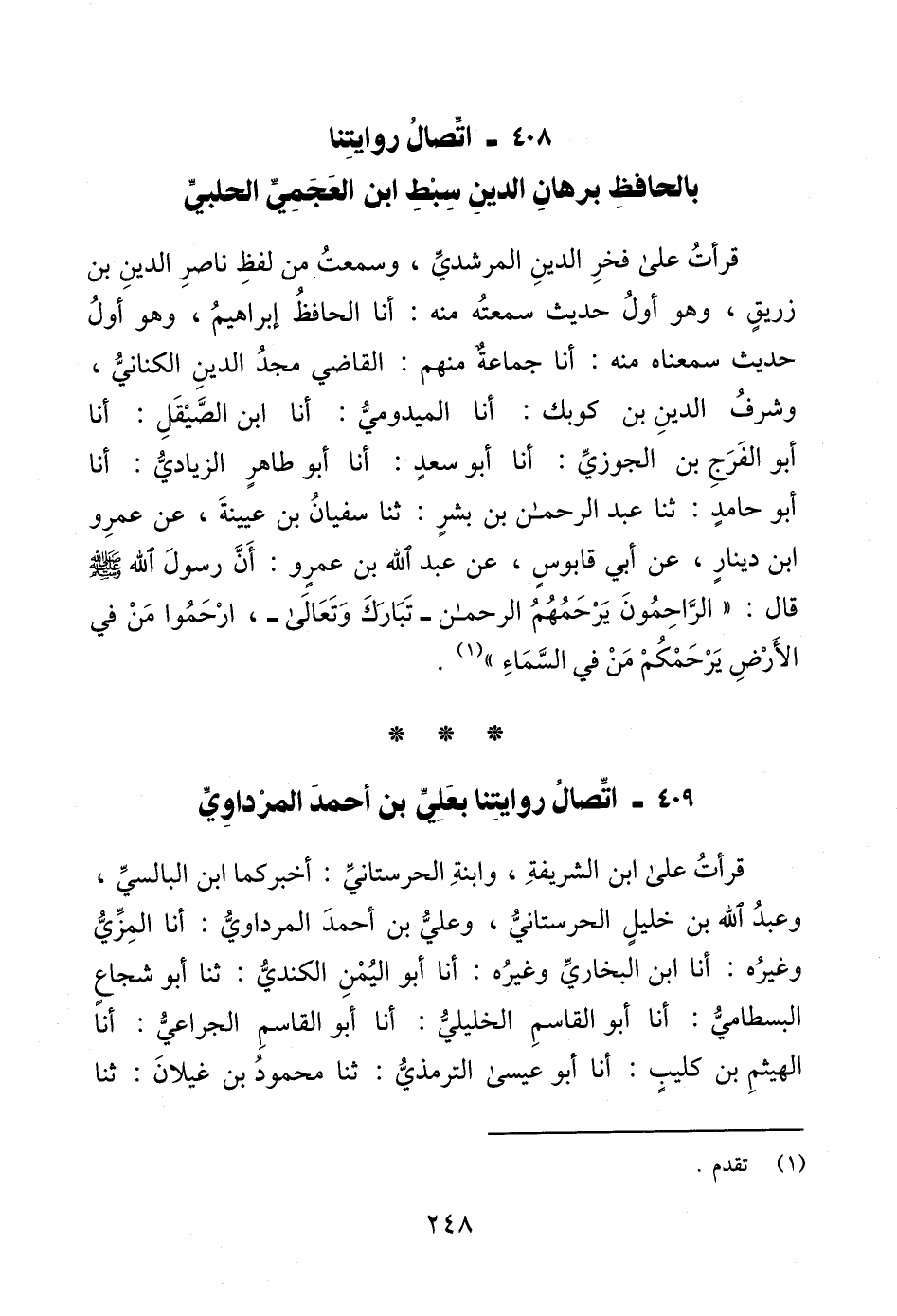 قرأتُ على فخرِ الدينِ المرشديِّ، وسمعتُ من لفظِ ناصرِ الدينِ بن زريقٍ، وهو أولُ حديث سمعتُه منه: أنا الحافظُ إبراهيمُ، وهو أولُ حديث سمعناه منه: أنا جماعةٌ منهم: القاضي مجدُ الدينِ الكنانيُّ، وشرفُ الدينِ بن كوبك: أنا الميدوميُّ: أنا ابن الصَّيْقَلِ: أنا أبو الفَرَجِ بن الجوزيِّ: أنا أبو سعدٍ: أنا أبو طاهرٍ الزياديُّ: أنا أبو حامدٍ: ثنا عبد الرحمن بن بشرٍ: ثنا سفيانُ بن عيينةَ، عن عمرِو ابن دينارٍ، عن أبي قابوسٍ، عن عبد الله بن عمرٍو: أَنَّ رسولَ الله - صلى الله عليه وسلم - قال: "الرَّاحِمُونَ يَرْحَمُهُمُ الرحمن -تَبَارَكَ وَتَعَالَى-، ارْحَمُوا مَنْ في الأَرْضِ يَرْحَمْكُمْ مَنْ في السَّمَاءِ" (¬1).