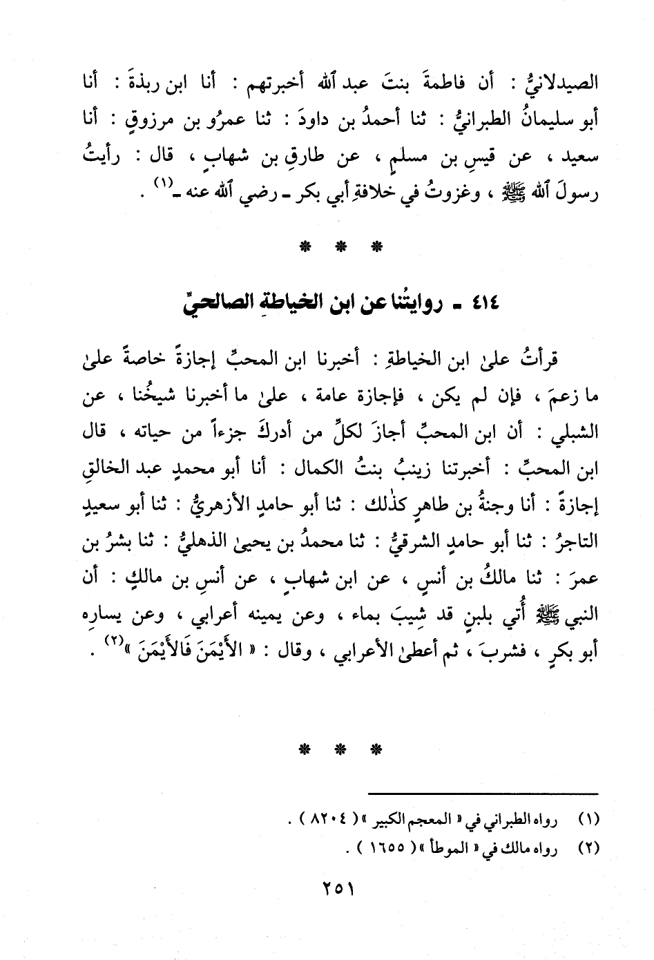 قرأتُ على ابن الخياطةِ: أخبرنا ابن المحبِّ إجازةً خاصةً على ما زعمَ، فإن لم يكن، فإجازة عامة، على ما أخبرنا شيخُنا، عن الشبلي: أن ابن المحبِّ أجازَ لكلِّ من أدركَ جزءًا من حياته، قال ابن المحبِّ: أخبرتنا زينبُ بنتُ الكمال: أنا أبو محمدٍ عبد الخالقِ إجازة: أنا وجنةُ بن طاهرٍ كذلك: ثنا أبو حامدٍ الأزهريُّ: ثنا أبو سعيدٍ التاجرُ: ثنا أبو حامدٍ الشرقيُّ: ثنا محمدُ بن يحيى الذهليُّ: ثنا بشرُ بن عمرَ: ثنا مالكُ بن أنسٍ، عن ابن شهابٍ، عن أنسِ بن مالكٍ: أن النبي - صلى الله عليه وسلم - أُتي بلبنٍ قد شِيبَ بماء، وعن يمينه أعرابي، وعن يسارِه أبو بكرٍ، فشربَ، ثم أعطى الأعرابي، وقال: "الأَيْمَنَ فَالأَيْمَنَ" (¬2).