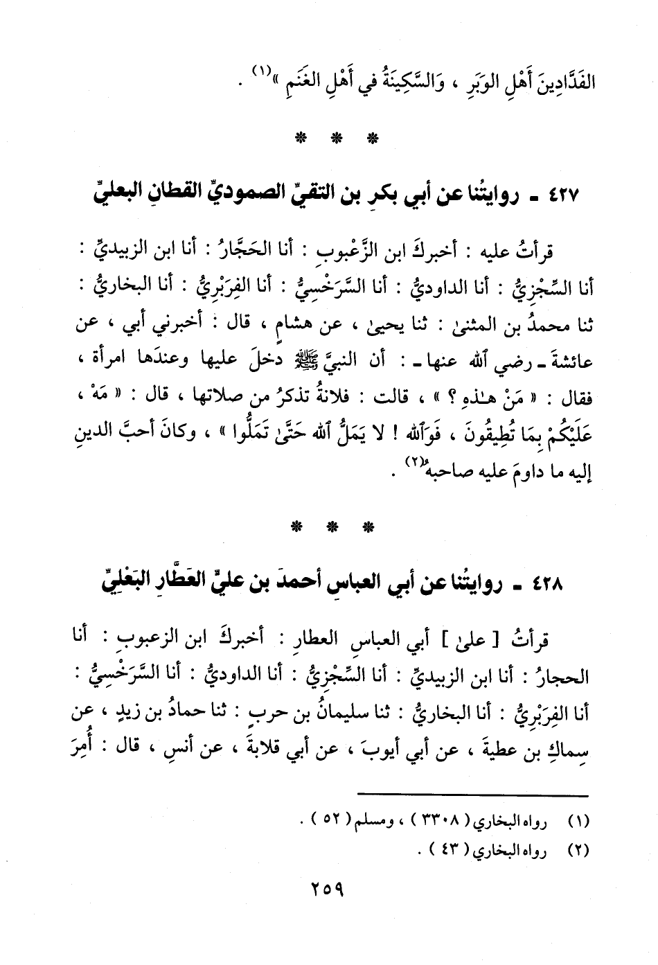 قرأتُ عليه: أخبركَ ابن الزَّعْبوبِ: أنا الحَجَّارُ: أنا ابن الزبيديِّ: أنا السِّجْزِيُّ: أنا الداوديُّ: أنا السَّرَخْسِيُّ: أنا الفِرَبْرِيُّ: أنا البخاريُّ: ثنا محمدُ بن المثنى: ثنا يحيى، عن هشامٍ، قال: أخبرني أبي، عن عائشةَ -رضي الله عنها-: أن النبيَّ - صلى الله عليه وسلم - دخلَ عليها وعندَها امرأة، فقال: "مَنْ هذهِ؟ "، قالت: فلانةُ تذكرُ من صلاتها، قال: "مَهْ، عَلَيْكُمْ بِمَا تُطِيقُونَ، فَوَالله! لا يَمَلُّ الله حَتَّى تَمَلُّوا"، وكانَ أحبَّ الدينِ إليه ما داومَ عليه صاحبهُ (¬2).