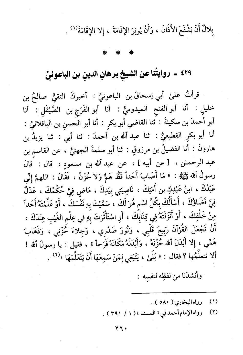 قرأتُ على أبي إسحاقَ بن الباعونيِّ: أخبركَ التقيُّ صالحُ بن خليلٍ: أنا أبو الفتحِ الميدوميُّ: أنا أبو الفَرَجِ بن الصَّيْقَلِ: أنا أبو أحمدَ بن سكينةَ: ثنا القاضي أبو بكرٍ: أنا أبو الحسنِ بن الباقلاني: أنا أبو بكرٍ القطيعي: ثنا عبد الله بن أحمدَ: ثنا أبي: ثنا يزيدُ بن هارونَ: أنا الفضيلُ بن مرزوقٍ: ثنا أبو سلمةَ الجهنيُّ، عن القاسمِ بن عبد الرحمن، [عن أبيه]، عن عبد الله بن مسعودٍ، قال: قالَ رسولُ الله - صلى الله عليه وسلم -: "مَا أَصَابَ أَحَدًا قَطُّ هَمٌّ وَلا حُزْنٌ، فَقَالَ: اللهمَّ إِنِّي عَبْدُكَ، ابنُ عَبْدِكِ بن أَمَتِكَ، نَاصِيَتِي بِيَدِكَ، مَاضٍ فِيَّ حُكْمُكَ، عَدْلٌ فيَّ قَضَاؤُكَ، أَسْأَلُكَ بِكُلِّ اسْمٍ هُوَ لَكَ، سَمَّيْتَ بِهِ نَفْسَكَ، أَوْ عَلَّمْتَهُ أَحَدًا مِنْ خَلْقِكَ، أَوْ أَنزلْتَهُ في كِتَابِكَ، أَوِ اسْتَأْثَرْتَ بِهِ في عِلْمِ الغَيْبِ عِنْدَكَ، أَنْ تَجْعَلَ القُرْآنَ رَبيعَ قَلْبِي، وَنُورَ صَدْرِي، وَجِلاءَ حُزْني، وَذَهَابَ هَمِّي، إِلا أَبْدَلَ الله حُزْنَهُ، وَأَبْدَلَهُ مَكَانَهُ فَرَجًا"، فقيل: يا رسولَ الله! ألا نتعلَّمُها؟ فقال: "بَلَى، يَنْبَغِي لِمَنْ سَمِعَهَا أَنْ يتعلَّمَهَا" (¬2).