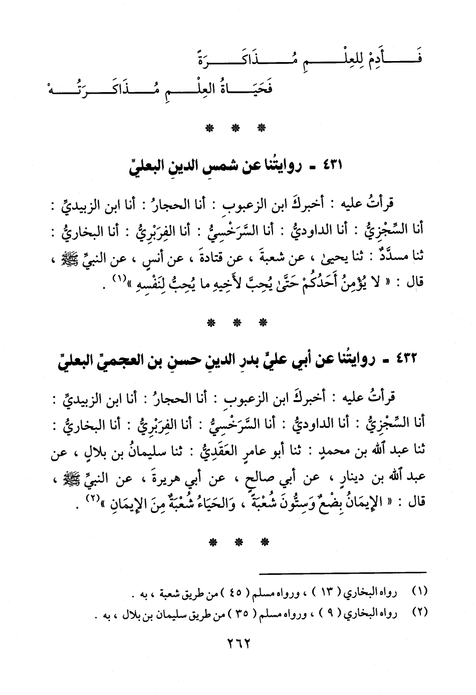 قرأتُ عليه: أخبركَ ابن الزعبوبِ: أنا الحجارُ: أنا ابن الزبيديِّ: أنا السِّجْزِيُّ: أنا الداوديُّ: أنا السَّرَخْسِيُّ: أنا الفِرَبْرِيُّ: أنا البخاريُّ: ثنا مسدَّد: ثنا يحيى، عن شعبةَ، عن قتادةَ، عن أنسٍ، عن النبيِّ - صلى الله عليه وسلم -، قال: "لا يُؤمِنُ أَحَدُكُمْ حَتَّى يُحِبَّ لأَخِيهِ ما يُحِبُّ لِنَفْسِهِ" (¬1).