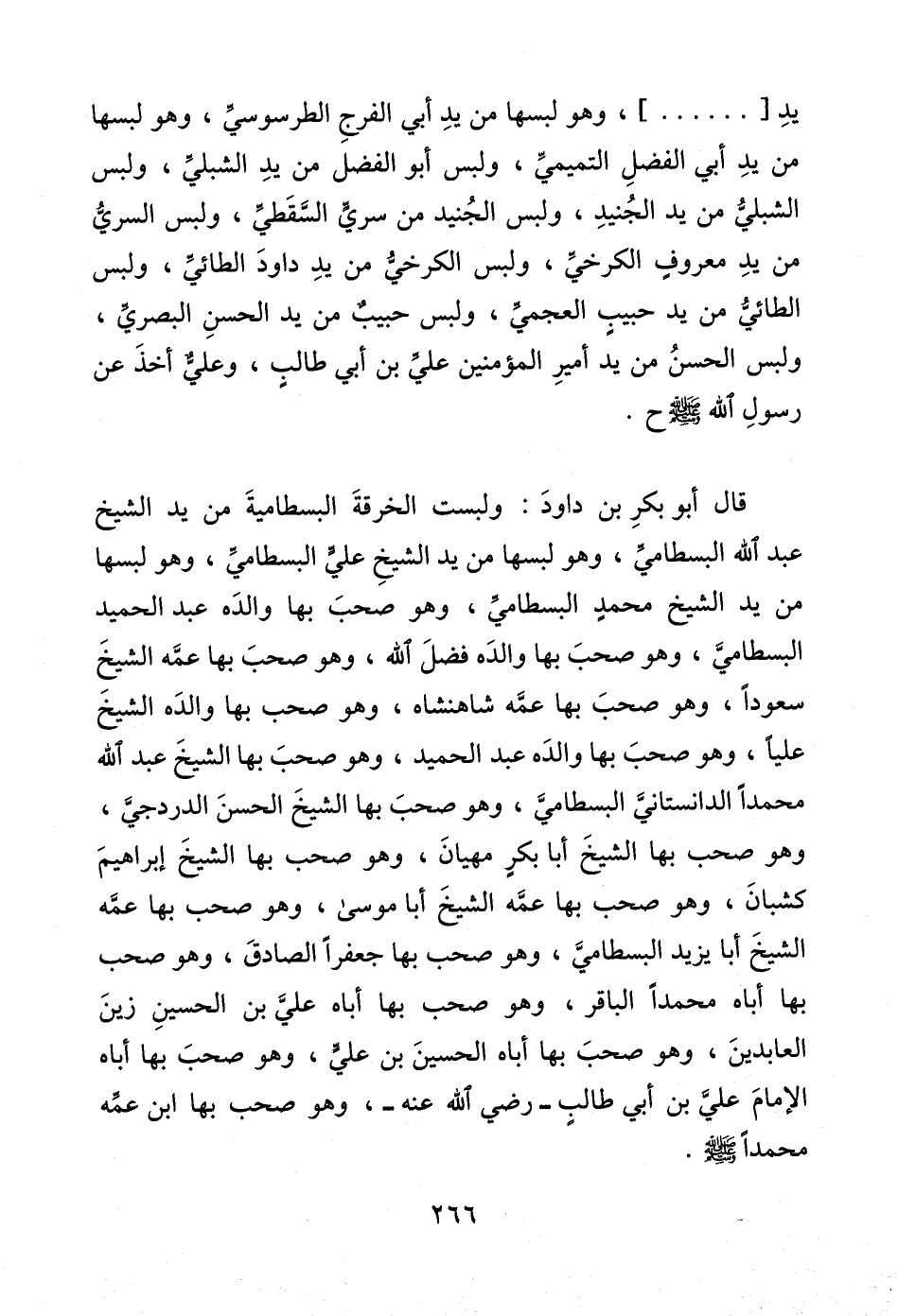 يدِ [......]، وهو لبسها من يدِ أبي الفرجِ الطرسوسيِّ، وهو لبسها من يدِ أبي الفضلِ التميميِّ، ولبس أبو الفضل من يدِ الشبليِّ، ولبس الشبليُّ من يد الجُنيدِ، ولبس الجُنيد من سريٍّ السَّقَطيّ، ولبس السريُّ من يدِ معروفٍ الكرخيِّ، ولبس الكرخيُّ من يدِ داودَ الطائيِّ، ولبس الطائيُّ من يد حبيبٍ العجميّ، ولبس حبيبٌ من يد الحسنِ البصريِّ، ولبس الحسنُ من يد أميرِ المؤمنين عليِّ بن أبي طالبٍ، وعليٌّ أخذَ عن رسولِ الله - صلى الله عليه وسلم - ح.