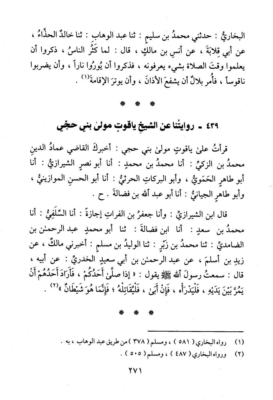قرأتُ على ياقوتٍ مولى بني حجي: أخبركَ القاضي عمادُ الدينِ محمدُ بن الزكيّ: أنا محمدُ بن محمدٍ: أنا أبو نصير الشيرازيُّ: أنا أبو طاهرٍ الحَمَويُّ، وأبو البركاتِ الحرثيُّ: أنا أبو الحسنِ الموازينيُّ، وأبو طاهرٍ الجيانيُّ: أنا أبو عبد الله بن فضالةَ. ح.