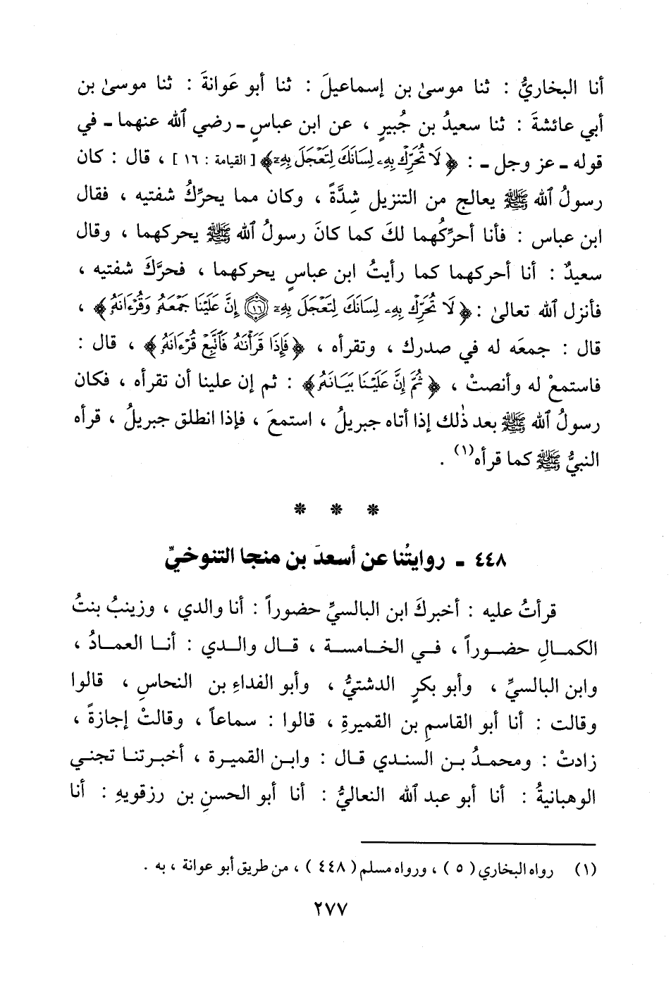 أنا البخاريُّ: ثنا موسى بن إسماعيلَ: ثنا أبو عَوانةَ: ثنا موسى بن أبي عائشةَ: ثنا سعيدُ بن جُبيرٍ، عن ابن عباسٍ -رضي الله عنهما- في قوله -عَزَّ وَجَلَّ-: {لَا تُحَرِّكْ بِهِ لِسَانَكَ لِتَعْجَلَ بِهِ} [القيامة: 16]، قال: كان رسولُ الله - صلى الله عليه وسلم - يعالج من التنزيل شِدَّةً، وكان مما يحرِّكُ شفتيه، فقال ابن عباس: فأنا أحرِّكُهما لكَ كما كانَ رسولُ الله - صلى الله عليه وسلم - يحركهما، وقال سعيدٌ: أنا أحرِّكهما كما رأيتُ ابن عباسٍ يحركهما، فحرَّكَ شفتيه، فأنزل الله تعالى: {لَا تُحَرِّكْ بِهِ لِسَانَكَ لِتَعْجَلَ بِهِ (16) إِنَّ عَلَيْنَا جَمْعَهُ وَقُرْآنَهُ}، قال: جمعَه له في صدرك، وتقرأه، {فَإِذَا قَرَأْنَاهُ فَاتَّبِعْ قُرْآنَهُ}، قال: فاستمعْ له وأنصتْ، {ثُمَّ إِنَّ عَلَيْنَا بَيَانَهُ}: ثم إن علينا أن تقرأه، فكان رسولُ الله - صلى الله عليه وسلم - بعد ذلك إذا أتاه جبريلُ، استمعَ، فإذا انطلق جبريلُ، قرأه النبيُّ - صلى الله عليه وسلم - كما قرأه (¬1).