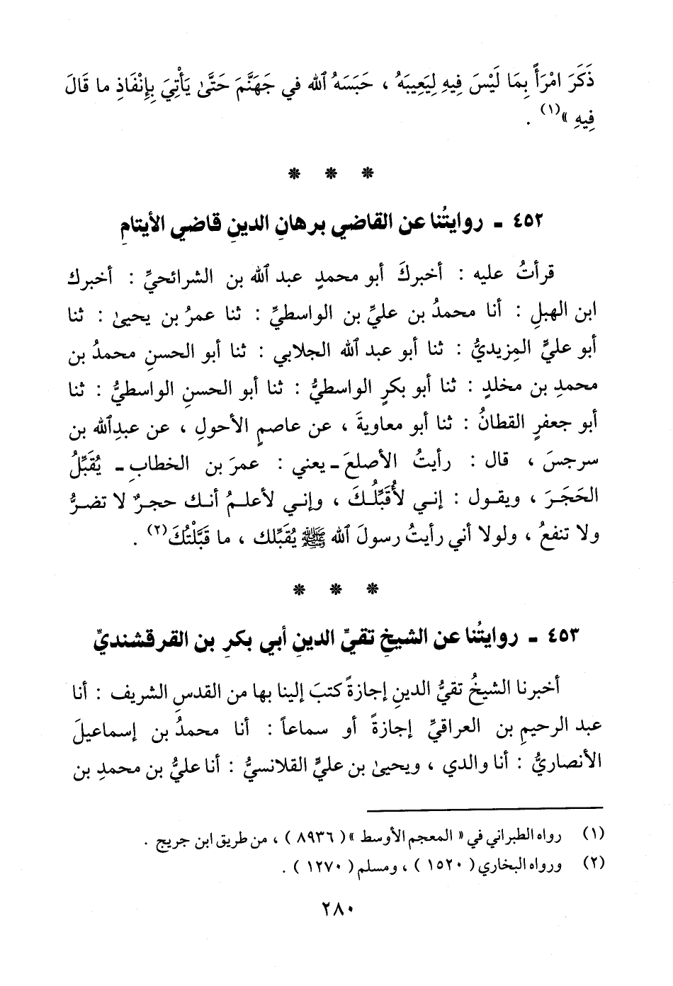 قرأتُ عليه: أخبركَ أبو محمدٍ عبد الله بن الشرائحيِّ: أخبرك ابن الهبلِ: أنا محمدُ بن عليِّ بن الواسطيِّ: ثنا عمرُ بن يحيى: ثنا أبو عليٍّ المِزيديُّ: ثنا أبو عبد الله الجلابي: ثنا أبو الحسنِ محمدُ بن محمدِ بن مخلدٍ: ثنا أبو بكر الواسطيُّ: ثنا أبو الحسنِ الواسطيُّ: ثنا أبو جعفرٍ القطانُ: ثنا أبو معاويةَ، عن عاصمٍ الأحولِ، عن عبدِ الله بن سرجسَ، قال: رأيتُ الأصلعَ -يعني: عمرَ بن الخطابِ- يُقَبِّلُ الحَجَرَ، ويقول: إني لأقَبِّلُكَ، وإني لأعلمُ أنك حجرٌ لا تضرُّ