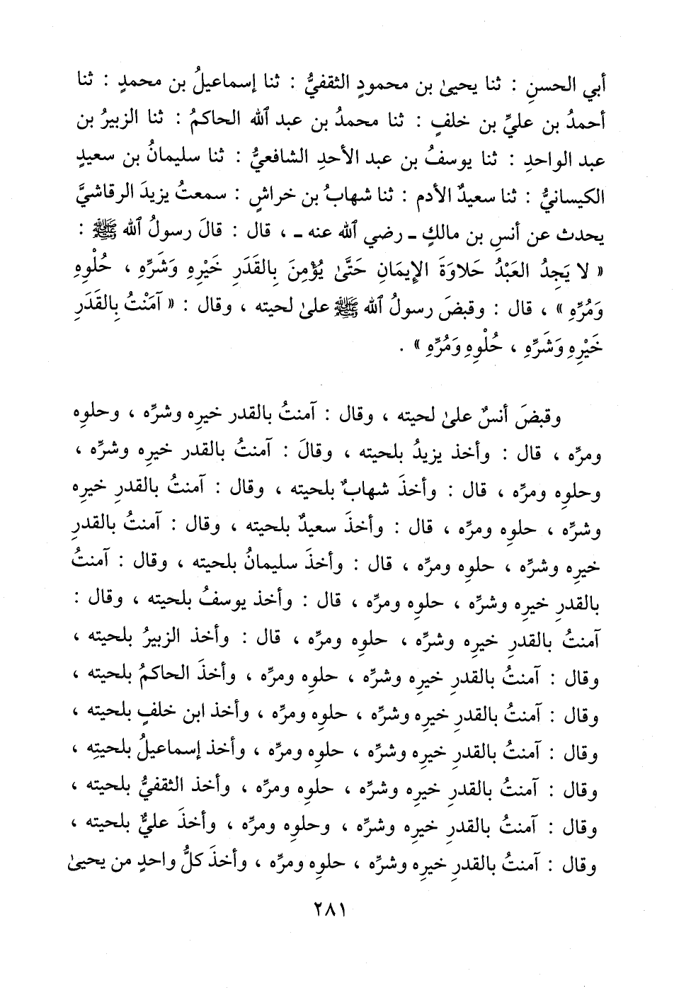 أبي الحسنِ: ثنا يحيى بن محمودٍ الثقفيُّ: ثنا إسماعيلُ بن محمدٍ: ثنا أحمدُ بن عليِّ بن خلفٍ: ثنا محمدُ بن عبد الله الحاكمُ: ثنا الزبيرُ بن عبد الواحدِ: ثنا يوسفُ بن عبد الأحدِ الشافعيُّ: ثنا سليمانُ بن سعيدٍ الكيسانيُّ: ثنا سعيدٌ الأدم: ثنا شهابُ بن خراشٍ: سمعتُ يزيدَ الرقاشيَّ يحدث عن أنسِ بن مالكٍ -رضي الله عنه-، قال: قالَ رسولُ الله - صلى الله عليه وسلم -: "لا يَجِدُ العَبْدُ حَلاوَةَ الإِيمَانِ حَتَّى يُؤمِنَ بِالقَدَرِ خَيْرِهِ وَشَرِّهِ، حُلْوِهِ وَمُرِّهِ"، قال: وقبضَ رسولُ الله - صلى الله عليه وسلم - على لحيته، وقال: "آمَنْتُ بِالقَدَرِ خَيْرِهِ وَشَرِّهِ، حُلْوِهِ وَمُرِّهِ".