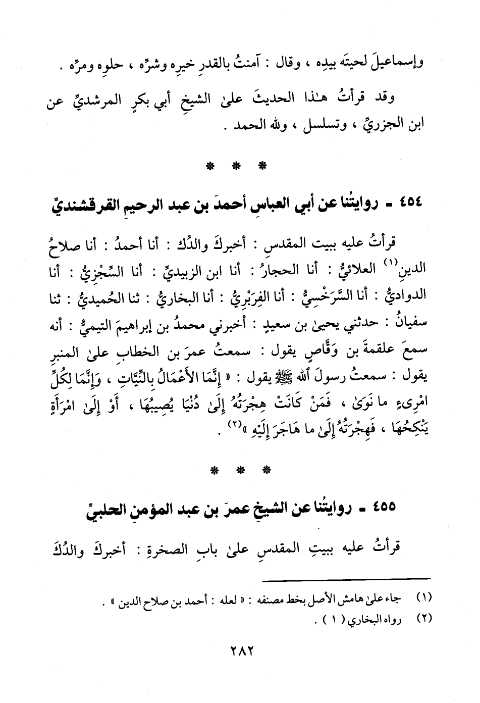 قرأتُ عليه ببيت المقدسِ: أخبركَ والدُك: أنا أحمدُ: أنا صلاحُ الدينِ (¬1) العلائيُّ: أنا الحجارُ: أنا ابن الزبيديِّ: أنا السِّجْزِيُّ: أنا الدواديُّ: أنا السَّرَخْسِيُّ: أنا الفِرَبْرِيُّ: أنا البخاريُّ: ثنا الحُميديُّ: ثنا سفيانُ: حدثني يحيى بن سعيدٍ: أخبرني محمدُ بن إبراهيمَ التيميُّ: أنه سمعَ علقمةَ بن وَقَّاصٍ يقول: سمعتُ عمرَ بن الخطابِ على المنبرِ يقول: سمعتُ رسولَ الله - صلى الله عليه وسلم - يقول: "إِنَّمَا الأَعْمَالُ بِالنِّيَّاتِ، وَإِنَّمَا لِكُلِّ امْرِىءٍ ما نَوَى، فَمَنْ كَانَتْ هِجْرَتُهُ إِلَى دُنْيَا يُصِيبُهَا، أَوْ إِلَى امْرَأَةٍ يَنكِحُهَا، فَهِجْرَتُهُ إِلَى ما هَاجَرَ إِلَيهِ" (¬2).