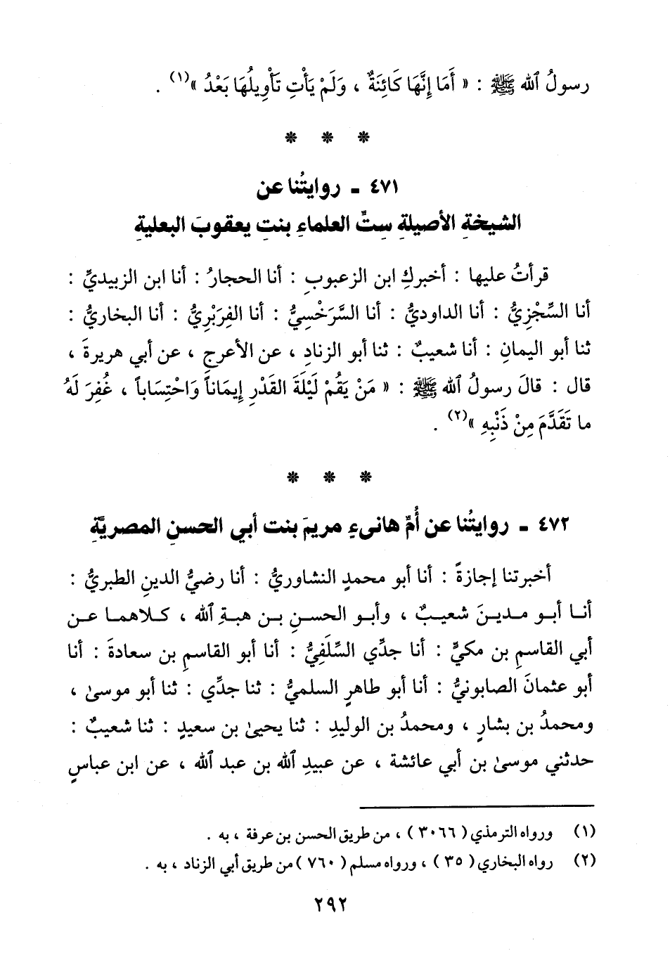 قرأتُ عليها: أخبركِ ابن الزعبوبِ: أنا الحجارُ: أنا ابن الزبيديِّ: أنا السِّجْزِيُّ: أنا الداوديُّ: أنا السَّرَخْسِيُّ: أنا الفِرَبْرِيُّ: أنا البخاريُّ: ثنا أبو اليمانِ: أنا شعيبٌ: ثنا أبو الزنادِ، عن الأعرجِ، عن أبي هريرةَ، قال: قالَ رسولُ الله - صلى الله عليه وسلم -: "مَنْ يَقُمْ لَيْلَةَ القَدْرِ إِيمَانًا وَاحْتِسَابًا، غُفِرَ لَهُ ما تَقَدَّمَ مِنْ ذَنْبِهِ" (¬2).