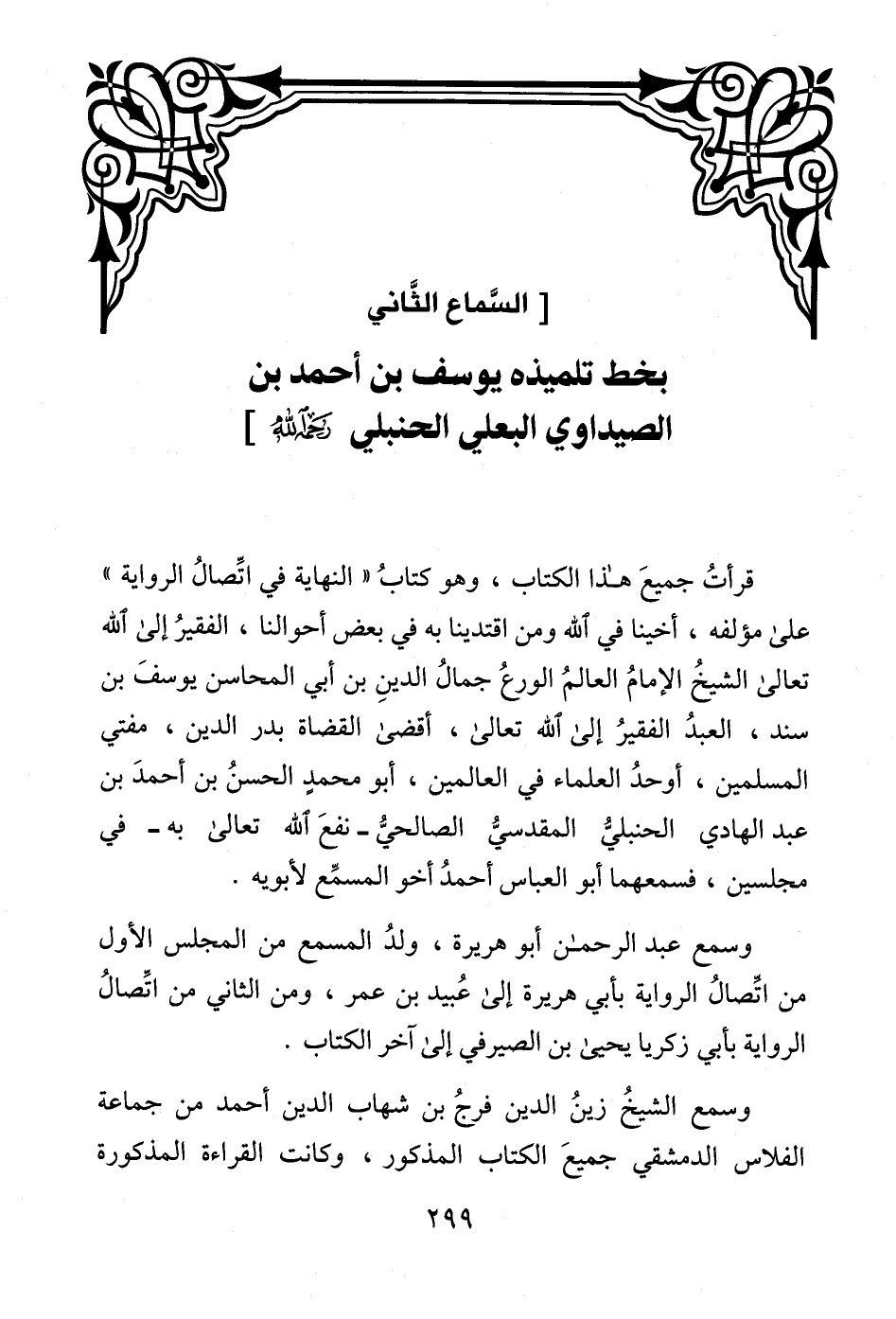 قرأتُ جميعَ هذا الكتاب، وهو كتابُ "النهاية في اتِّصالُ الرواية" على مؤلفه، أخينا في الله ومن اقتدينا به في بعض أحوالنا، الفقيرُ إلى الله تعالى الشيخُ الإمامُ العالمُ الورعُ جمالُ الدينِ بن أبي المحاسن يوسفَ بن سند، العبدُ الفقيرُ إلى الله تعالى، أقضى القضاة بدر الدين، مفتي المسلمين، أوحدُ العلماء في العالمين، أبو محمدٍ الحسنُ بن أحمدَ بن عبد الهادي الحنبليُّ المقدسيُّ الصالحيُّ -نفعَ الله تعالى به- في مجلسين، فسمعهما أبو العباس أحمدُ أخو المسمِّع لأبويه.