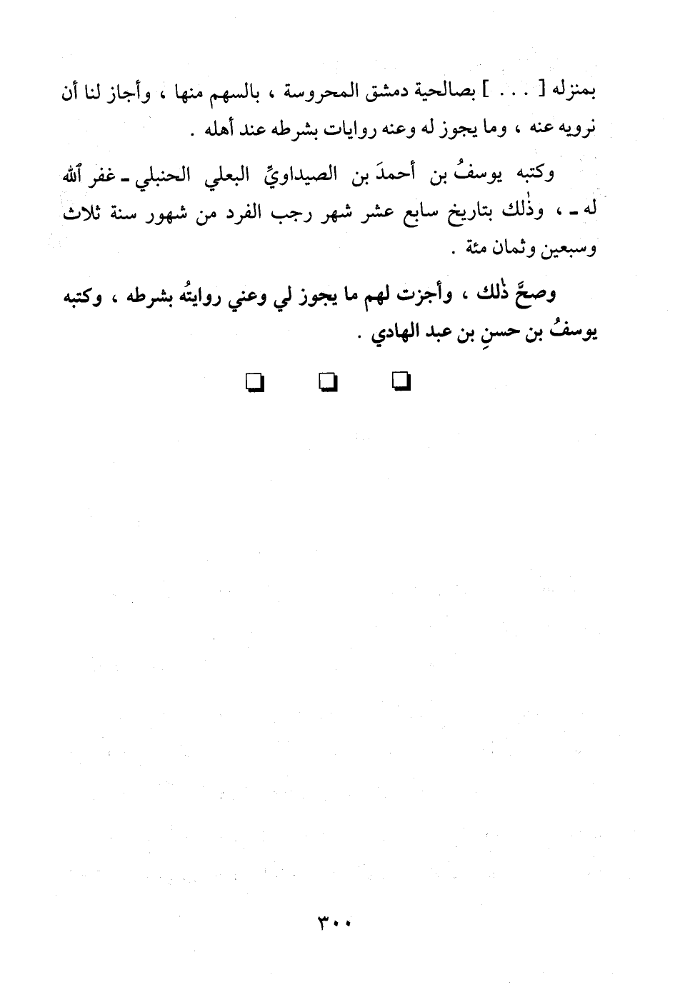 وصحَّ ذلك، وأجزت لهم ما يجوز لي وعني روايتُه بشرطه، وكتبه يوسفُ بن حسنِ بن عبد الهادي.