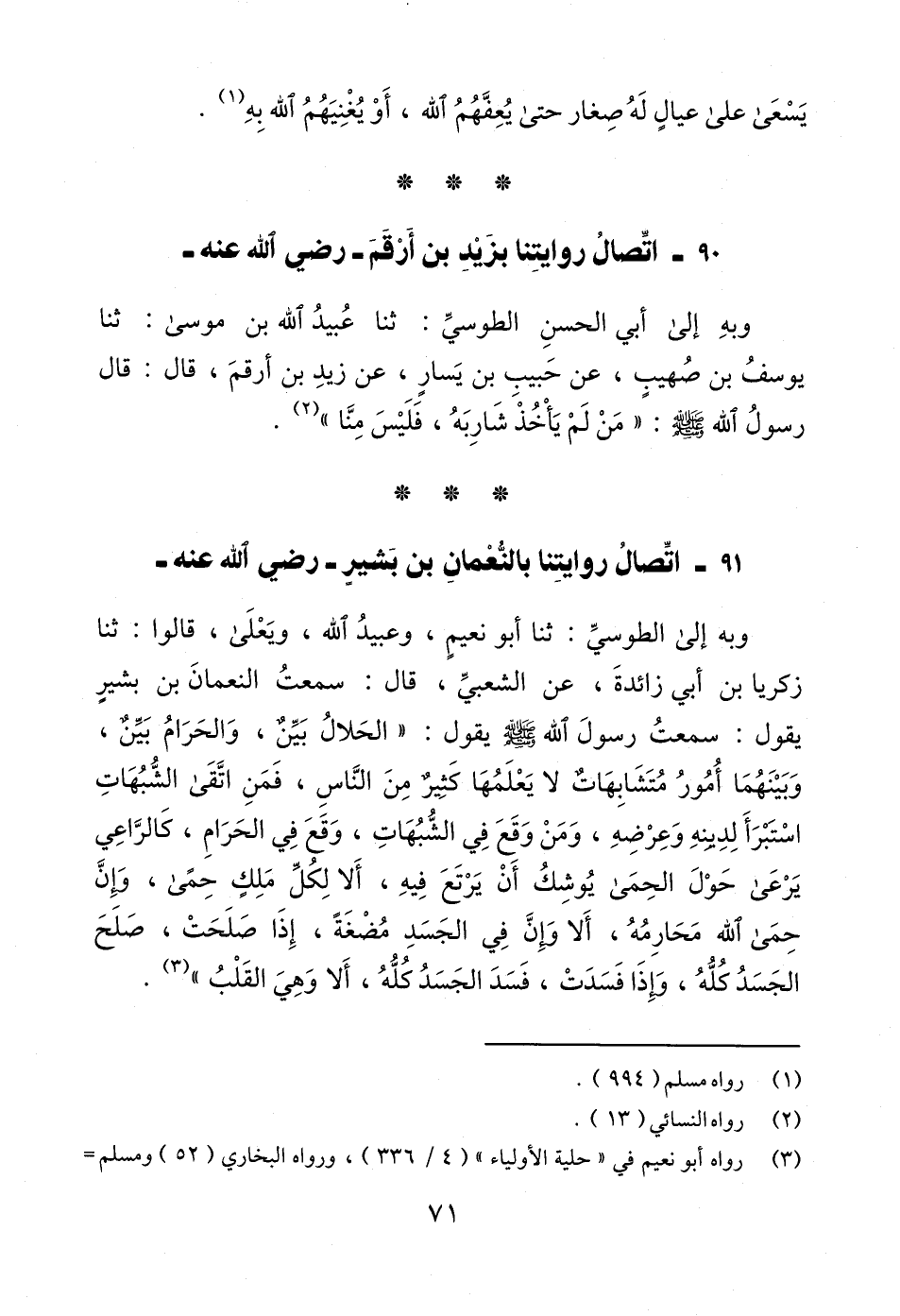 وبه إلى الطوسيِّ: ثنا أبو نعيمٍ، وعبيدُ الله، ويَعْلَى، قالوا: ثنا زكريا بن أبي زائدةَ، عن الشعبيِّ، قال: سمعتُ النعمانَ بن بشيير يقول: سمعتُ رسولَ الله - صلى الله عليه وسلم - يقول: "الحَلالُ بَيِّنٌ، وَالحَرَامُ بَيِّنٌ، وَبَيْنَهُمَا أُمُورُ مُتَشَابِهَاتٌ لا يَعْلَمُهَا كَثيرٌ مِنَ النَّاسِ، فَمَنِ اتَّقَى الشُّبُهَاتِ اسْتبرَأَ لِدِينهِ وَعِرْضِهِ، وَمَنْ وَقَعَ فِي الشُّبُهَاتِ، وَقَعَ فِي الحَرَامِ، كَالرَّاعِي يَرْعَى حَوْلَ الحِمَى يُوشِكُ أَنْ يَرْتَعَ فِيهِ، أَلا لِكُلِّ مَلِكٍ حِمًى، وَإِنَّ حِمَى الله مَحَارِمُهُ، أَلا وَإِنَّ فِي الجَسَدِ مُضْغَةً، إِذَا صَلَحَتْ، صَلَحَ الجَسَدُ كُلُّهُ، وَإِذَا فَسَدَتْ، فَسَدَ الجَسَدُ كُلُّهُ، أَلا وَهِيَ القَلْبُ" (¬3).