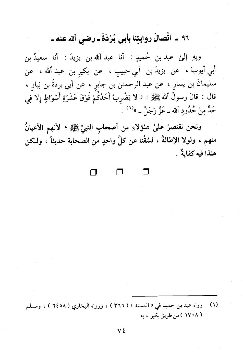وبهِ إلى عبد بن حُميدٍ: أنا عبد الله بن يزيدَ: أنا سعيدُ بن أبي أيوبَ، عن يزيدَ بن أبي حبيبٍ، عن بكيرِ بن عبد الله، عن سليمانَ بن يسارٍ، عن عبد الرحمن بن جابرٍ، عن أبي بردةَ بن نِيارٍ، قال: قالَ رسولُ الله - صلى الله عليه وسلم -: "لا يَضْرِبْ أَحَدُكُمْ فَوْقَ عَشَرَةِ أَسْوَاطٍ إِلا فِي حَدٍّ مِنْ حُدُودِ الله -عَزَّ وَجَلَّ-" (¬1).