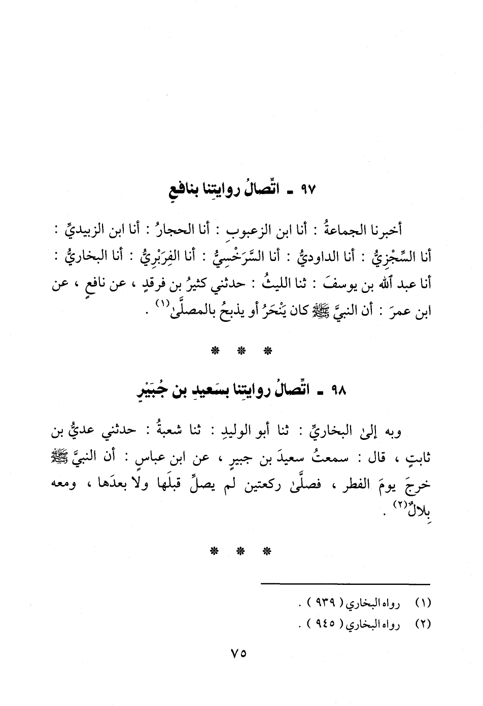 أخبرنا الجماعةُ: أنا ابن الزعبوبِ: أنا الحجارُ: أنا ابن الزبيديِّ: أنا السِّجْزِيُّ: أنا الداوديُّ: أنا السَّرَخْسِيُّ: أنا الفِرَبْرِيُّ: أنا البخاريُّ: أنا عبد الله بن يوسفَ: ثنا الليثُ: حدثني كثيرُ بن فرقدٍ، عن نافعٍ، عن ابن عمرَ: أن النبيَّ - صلى الله عليه وسلم - كان يَنْحَرُ أو يذبحُ بالمصلَّى (¬1).