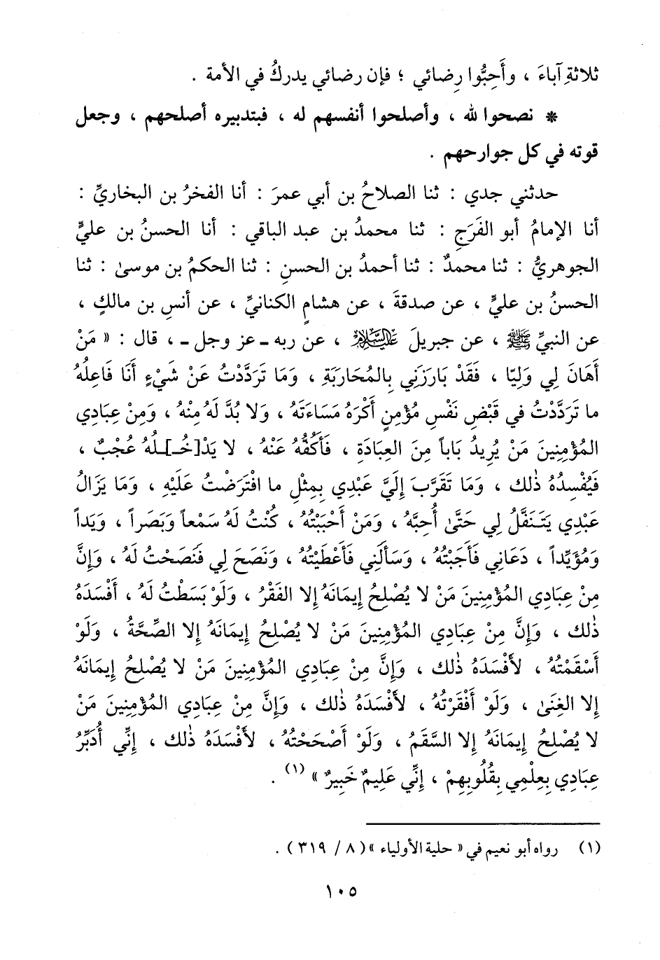 حدثني جدي: ثنا الصلاحُ بن أبي عمرَ: أنا الفخرُ بن البخاريِّ: أنا الإمامُ أبو الفَرَجِ: ثنا محمدُ بن عبد الباقي: أنا الحسنُ بن عليٍّ الجوهريُّ: ثنا محمدٌ: ثنا أحمدُ بن الحسنِ: ثنا الحكمُ بن موسى: ثنا الحسنُ بن عليٍّ، عن صدقةَ، عن هشامٍ الكنانيِّ، عن أنسِ بن مالكٍ، عن النبيِّ - صلى الله عليه وسلم -، عن جبريلَ -عليه السلام-، عن ربه -عَزَّ وَجَلَّ-، قال: "مَنْ أَهَانَ لِي وَلِيّا، فَقَدْ بَارَزَنِي بِالمُحَارَبَةِ، وَمَا تَرَدَّدْتُ عَنْ شَيْءٍ أَنَا فَاعِلُهُ ما تَرَدَّدْتُ في قَبْضِ نَفْسِ مُؤْمِنٍ أَكْرَهُ مَسَاءَتَهُ، وَلا بُدَّ لَهُ مِنْهُ، وَمِنْ عِبَادِي المُؤْمِنِينَ مَنْ يُرِيدُ بَابًا مِنَ العِبَادَةِ، فَأَكُفُّهُ عَنْهُ، لا يَدْ [خُـ]ـلُهُ عُجْبٌ، فَيُفْسِدُهُ ذلك، وَمَا تَقَرَّبَ إِلَيَّ عَبْدِي بِمِثْلِ ما افْتَرَضْتُ عَلَيْهِ، وَمَا يَزَالُ عَبْدِي يَتَنَقَّلُ لِي حَتَّى أُحِبَّهُ، وَمَنْ أَحْبَبْتُهُ، كُنْتُ لَهُ سَمْعًا وَبَصَرًا، وَيَدًا وَمُؤَيِّدًا، دَعَانِي فَأَجَبْتُهُ، وَسَأَلَنِي فَأَعْطَيْتُهُ، وَنَصَحَ لِي فَنَصَحْتُ لَهُ، وَإِنَّ مِنْ عِبَادِي المُؤْمِنِينَ مَنْ لا يُصْلحُ إِيمَانَهُ إِلا الفَقْرُ، وَلَوْ بَسَطْتُ لَهُ، أَفْسَدَهُ ذلك، وَإِنَّ مِنْ عِبَادِي المُؤْمِنِينَ مَنْ لا يُصْلحُ إِيمَانَهُ إِلا الصِّحَّةُ، وَلَوْ أَسْقَمْتُهُ، لأَفْسَدَهُ ذلك، وَإِنَّ مِنْ عِبَادِي المُؤْمِنِينَ مَنْ لا يُصْلحُ إِيمَانَهُ إِلا الغِنَى, وَلَوْ أَفْقَرْتُهُ، لأَفْسَدَهُ ذلك، وَإِنَّ مِنْ عِبَادِي المُؤْمِنِينَ مَنْ لا يُصْلحُ إِيمَانَهُ إِلا السَّقَمُ، وَلَوْ أَصْحَحْتُهُ، لأفْسَدَهُ ذلك، إِنِّي أُدَبِّرُ عِبَادِي بِعِلْمِي بِقُلُوبِهِمْ، إِنِّي عَلِيمٌ خَبِيرٌ" (¬1).