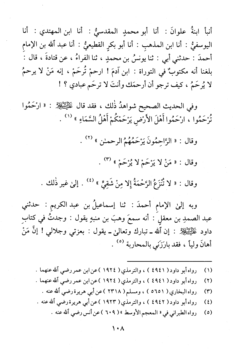أنبأ ابنةُ علوانَ: أنا أبو محمدٍ المقدسيُّ: أنا ابن المهتدي: أنا اليوسفيُّ: أنا ابن المذهبِ: أنا أبو بكرٍ القطيعيُّ: أنا عبد الله بن الإمامِ أحمدَ: حدثني أبي: ثنا يونسُ بن محمدٍ، ثنا الفراءُ، عن قتادةَ، قال: بلغنا أنه مكتوبٌ في التوراة: ابن آدمَ! ارحمْ تُرحَمْ، إنه مَنْ لا يرحمُ لا يُرحَمُ، كيف ترجو أن أرحمَك وأنتَ لا ترحَم عبادي؟!