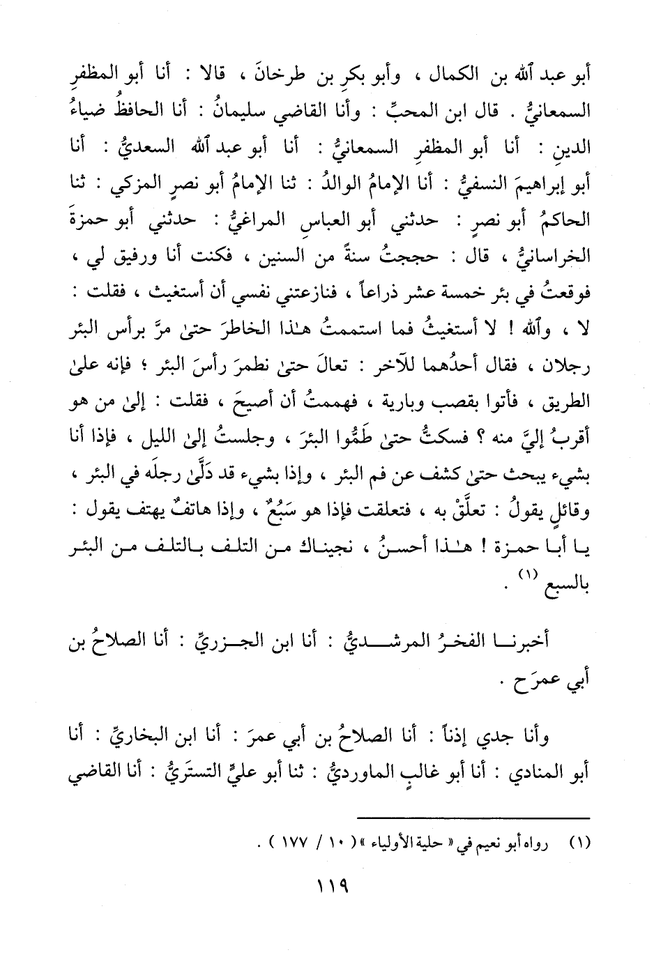 أبو عبد الله بن الكمال، وأبو بكرِ بن طرخانَ، قالا: أنا أبو المظفرِ السمعانيُّ. قال ابن المحبِّ: وأنا القاضي سليمانُ: أنا الحافظُ ضياءُ الدينِ: أنا أبو المظفرِ السمعانيُّ: أنا أبو عبد الله السعديُّ: أنا أبو إبراهيمَ النسفيُّ: أنا الإمامُ الوالدُ: ثنا الإمامُ أبو نصرٍ المزكي: ثنا الحاكمُ أبو نصرٍ: حدثني أبو العباسِ المراغيُّ: حدثني أبو حمزةَ الخراسانيُّ، قالَّ: حججتُ سنةً من السنين، فكنت أنا ورفيق لي، فوقعتُ في بئر خمسة عشر ذراعًا، فنازعتني نفسي أن أستغيث، فقلت: لا، والله! لا أستغيثُ فما استممتُ هذا الخاطرَ حتى مرَّ برأس البئر رجلان، فقال أحدُهما للَاخر: تعالَ حتى نطمرَ رأسَ البئر؛ فإنه على الطريق، فأتوا بقصب وبارية، فهممتُ أن أصيحَ، فقلت: إلى من هو أقربُ إليَّ منه؟ فسكتُّ حتى طَمُّوا البئرَ، وجلستُ إلى الليل، فإذا أنا بشيء يبحث حتى كشف عن فم البئر، وإذا بشيء قد دَلَّى رجلَه في البئر، وقائلٍ يقولُ: تعلَّقْ به، فتعلقت فإذا هو سَبُعٌ، وإذا هاتفٌ يهتف يقول: يا أبا حمزة! هذا أحسنُ، نجيناك من التلف بالتلف من البئر بالسبع (¬1).