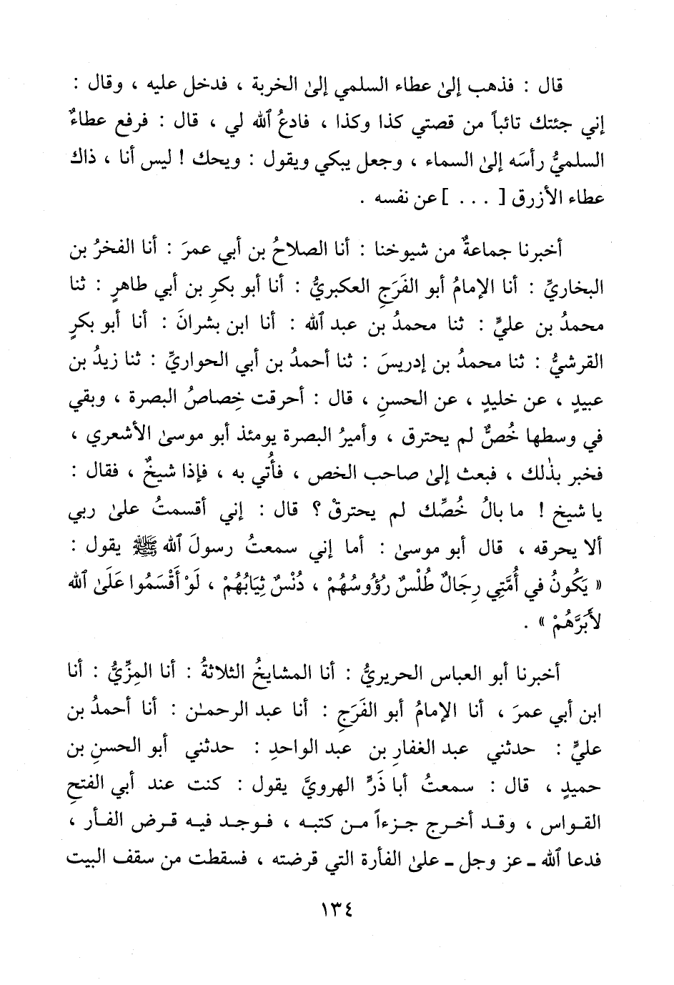 أخبرنا جماعةٌ من شيوخنا: أنا الصلاحُ بن أبي عمرَ: أنا الفخرُ بن البخاريِّ: أنا الإمامُ أبو الفَرَجِ العكبريُّ: أنا أبو بكرِ بن أبي طاهرٍ: ثنا محمدُ بن عليٍّ: ثنا محمدُ بن عبد الله: أنا ابن بشرانَ: أنا أبو بكرٍ القرشيُّ: ثنا محمدُ بن إدريسَ: ثنا أحمدُ بن أبي الحواريِّ: ثنا زيدُ بن عبيدٍ، عن خليدٍ، عن الحسنِ، قال: أحرقت خِصاصُ البصرة، وبقي في وسطها خُصٌّ لم يحترق، وأميرُ البصرة يومئذ أبو موسى الأشعري، فخبر بذلك، فبعث إلى صاحب الخص، فأُتي به، فماذا شيخٌ، فقال: يا شيخ! ما بالُ خُصِّك لم يحترقْ؟ قال: إني أقسمتُ على ربي ألا يحرقه، قال أبو موسى: أما إني سمعتُ رسولَ الله - صلى الله عليه وسلم - يقول: "يَكُونُ في أُمَّتِي رِجَالٌ طُلْسٌ رُؤُوسُهُمْ، دُنْسٌ ثِيَابُهُمْ، لَوْ أَقْسَمُوا عَلَى الله لأَبَرَهُمْ".