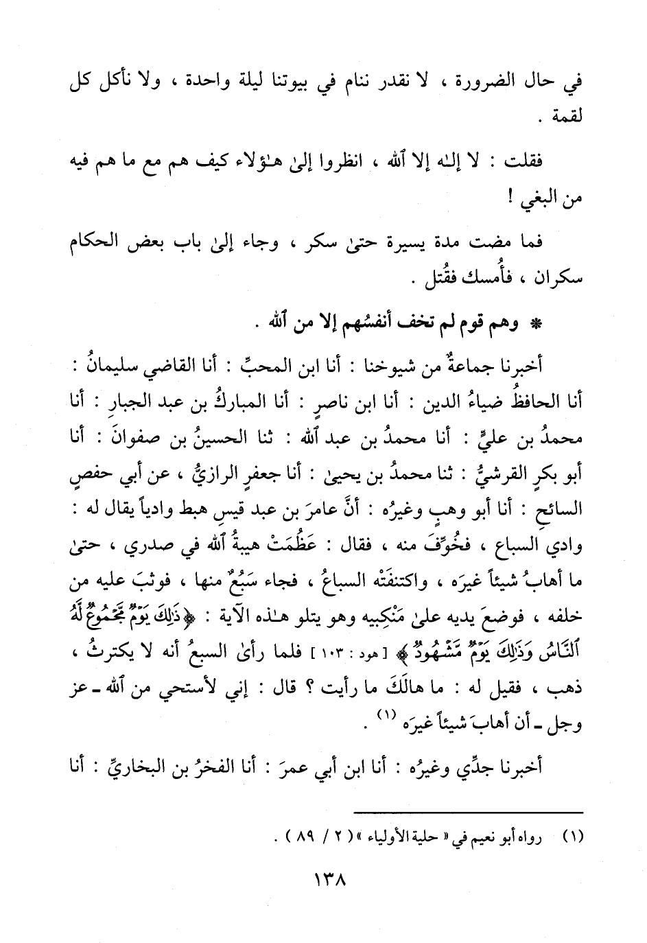 أخبرنا جماعةٌ من شيوخنا: أنا ابن المحبِّ: أنا القاضي سليمانُ: أنا الحافظُ ضياءُ الدين: أنا ابن ناصرٍ: أنا المباركُ بن عبد الجبارِ: أنا محمدُ بن عليٍّ: أنا محمدُ بن عبد الله: ثنا الحسينُ بن صفوانَ: أنا أبو بكرٍ القرشيُّ: ثنا محمدُ بن يحيى: أنا جعفرٍ الرازيُّ، عن أبي حفصٍ السائحِ: أنا أبو وهبٍ وغيرُه: أنَّ عامرَ بن عبد قيسِ هبط واديًا يقال له: وادي السباع، فخُوِّفَ منه، فقال: عَظُمَتْ هيبةُ الله في صدري، حتى ما أهابُ شيئًا غيرَه، واكتنفَتْه السباعُ، فجاء سَبُعٌ منها، فوثبَ عليه من خلفه، فوضعَ يديه على مَنْكِبيه وهو يتلو هذه الَآية: {ذَلِكَ يَوْمٌ مَجْمُوعٌ لَهُ النَّاسُ وَذَلِكَ يَوْمٌ مَشْهُودٌ} [هود: 103] فلما رأى السبعُ أنه لا يكترثُ، ذهب، فقيل له: ما هالَكَ ما رأيت؟ قال: إني لأستحي من الله -عَزَّ وَجَلَّ- أن أهابَ شيئًا غيرَه (¬1).