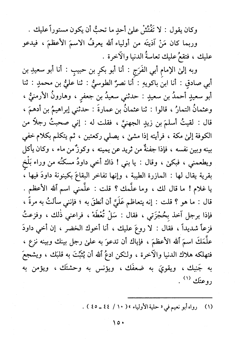 وبه إلى الإمامِ أبي الفَرَجِ: أنا أبو بكرِ بن حبيبٍ: أنا أبو سعيدِ بن أبي صادقٍ: أنا ابن باكويهِ: أنا نصرٌ الطوسيُّ: ثنا عليُّ بن محمدٍ: ثنا أبو سعيدٍ أحمدُ بن سعيدٍ: حدثني سعيدُ بن جعفرٍ، وهارونُ الأرمنيُّ، وعثمانُ التمارُ، قالوا: ثنا عثمانُ بن عمارةَ: حدثني إبراهيمُ بن أدهمَ، قال: لقيتُ أسلمَ بن زيدٍ الجهنيَّ، فقلت له: إني صحبتُ رجلاً من الكوفة إلى مكة، فرأيته إذا مشى، يصلي ركعتين، ثم يتكلم بكلام خفي بينه وبين نفسه، فإذا جفنةٌ من ثريد عن يمينه، وكوزٌ من ماء، وكان يأكل ويطعمني، فبكى، وقال: يا بني! ذاك أخي داودُ مسكنُه من وراء بَلْخٍ بقرية يقال لها: المازرة الطيبة، وإنها تفاخر البقاعَ بكينونة داودَ فيها، يا غلام! ما قال لك، وما علَّمك؟ قلت: علَّمني اسم الله الأعظم. قال: ما هو؟ قلت: إنه يتعاظم عَلَيَّ أن أنطقَ به؛ فإنني سألتُ به مرةً، فإذا برجل آخذ بِحُجْزَتي، فقال: سَلْ تُعْطَهْ، فراعني ذلك، وفزعتُ فزعًا شديدًا، فقال: لا روعَ عليك، أنا أخوك الخضر، إن أخي داودَ علَّمَكَ اسمَ الله الأعظمَ، فإياك أن تدعوَ به على رجل بينك وبينه نزع، فتهلكه هلاك الدنيا والآخرة، ولكن ادعُ الله أن يُثَبِّتَ به قلبَك، ويشجعَ به جَنبك، ويقويَ به ضعفَك، ويؤنس به وحشتَك، ويؤمن به روعتك (¬1).