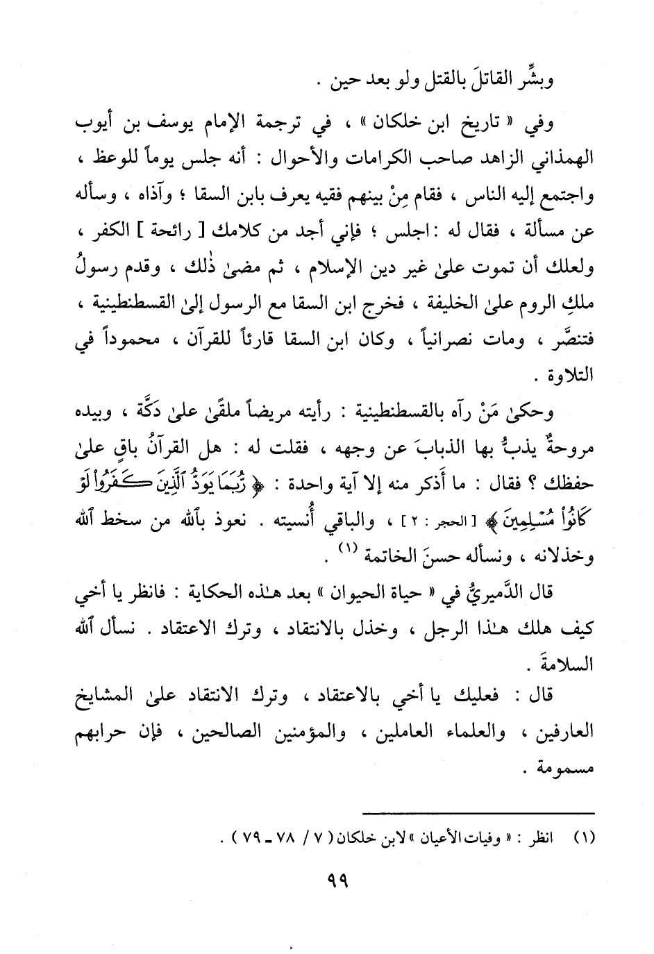 وفي "تاريخ ابن خلكان"، في ترجمة الإمام يوسف بن أيوب الهمذاني الزاهد صاحب الكرامات والأحوال: أنه جلس يومًا للوعظ، واجتمع إليه الناس، فقام مِنْ بينهم فقيه يعرف بابن السقا، وآذاه، وسأله عن مسألة، فقال له: اجلس؛ فإني أجد من كلامك [رائحة] الكفر، ولعلك أن تموت على غير دين الإِسلام، ثم مضى ذلك، وقدم رسولُ ملكِ الروم على الخليفة، فخرج ابن السقا مع الرسول إلى القسطنطينية، فتنصَّر، ومات نصرانيًا، وكان ابن السقا قارئًا للقرآن، محمودًا في التلاوة.