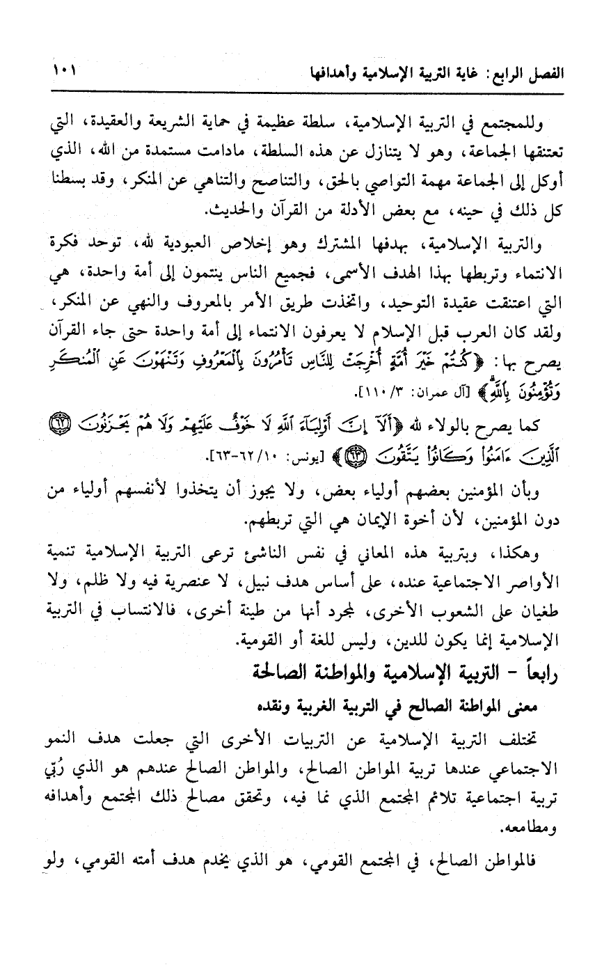 والتربية الإسلامية، بهدفنا المشترك وهو إخلاص العبودية لله، توحد فكرة الانتماء، وتربطها بهذا الهدف الأسمى، فجميع الناس ينتمون إلى أمة واحدة، هي التي اعتنقت عقيدة التوحيد، واتخذت طريق الأمر بالمعروف، والنهي عن المنكر، ولقد كان العرب قبل الإسلام لا يعرفون الانتماء إلى أمة واحدة حتى جاء القرآن يصرح بها: {كُنْتُمْ خَيْرَ أُمَّةٍ أُخْرِجَتْ لِلنَّاسِ تَأْمُرُونَ بِالْمَعْرُوفِ وَتَنْهَوْنَ عَنِ الْمُنْكَرِ وَتُؤْمِنُونَ بِاللَّهِ} [آل عمران: 3/ 110] .