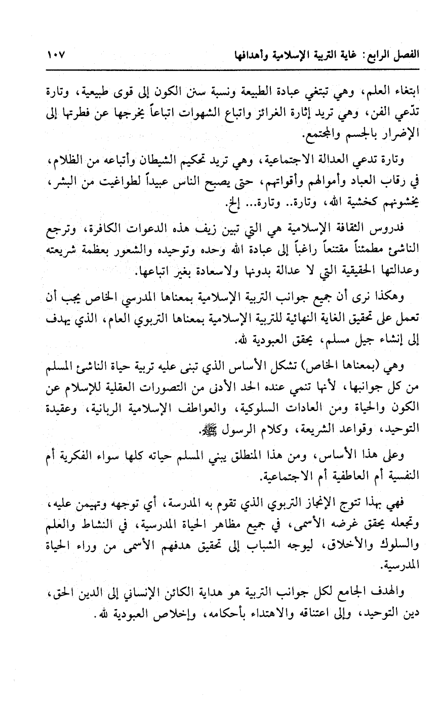 وهكذا نرى أن جميع جوانب التربية الإسلامية بمعناها المدرسي الخاص يجب أن تعمل على تحقيق الغاية النهائية للتربية الإسلامية بمعناها التربوي العام، الذي يهدف إلى إنشاء جيل مسلم، يحقق العبودية لله.