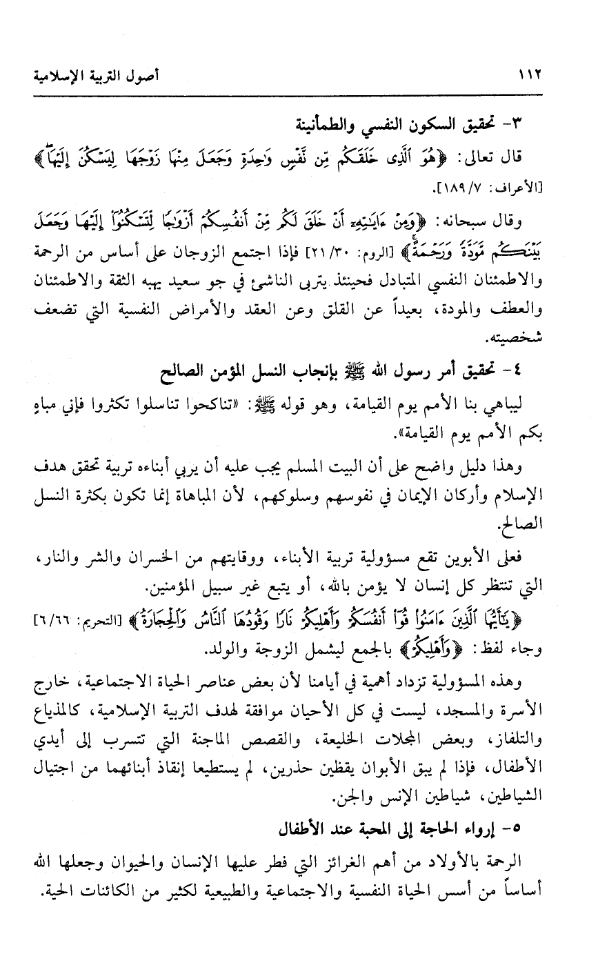 وقال سبحانه: {وَمِنْ آيَاتِهِ أَنْ خَلَقَ لَكُمْ مِنْ أَنْفُسِكُمْ أَزْوَاجًا لِتَسْكُنُوا إِلَيْهَا وَجَعَلَ بَيْنَكُمْ مَوَدَّةً وَرَحْمَةً} [الروم: 30/ 21] ، فإذا اجتمع الزوجان على أساس من الرحمة، والاطمئنان النفسي المتبادل، فحينئذ يتربى الناشئ في جو سعيد يهبه الثقة، والاطمئنان والعطف والمودة، بعيدا عن القلق وعن العقد، والأمراض النفسية التي تضعف شخصيته.