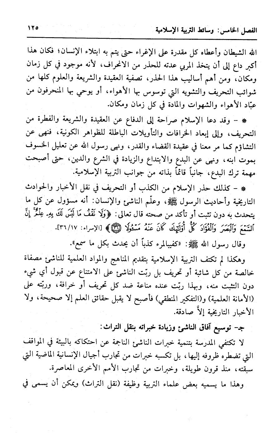 *- كذلك حذر الإسلام من الكذب أو التحريف في نقل الأخبار، والحوادث التاريخية، وأحاديث الرسول صلى الله عليه وسلم، وعلم الناشئ والإنسان: أنه مسئول عن كل ما يتحدث به تثبت، أو تأكد من صحته قال تعالى: {وَلا تَقْفُ مَا لَيْسَ لَكَ بِهِ عِلْمٌ إِنَّ السَّمْعَ وَالْبَصَرَ وَالْفُؤَادَ كُلُّ أُولَئِكَ كَانَ عَنْهُ مَسْؤُولًا} [الإسراء: 17/ 36] .