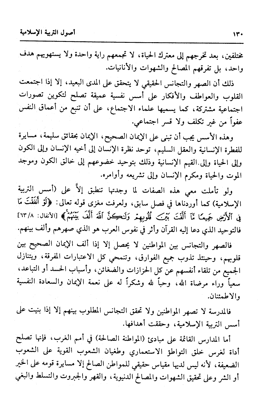 فالمدرسة لا تصهر المواطنين، ولا تحقق التجانس المطلوب بينهم إلا إذا بنيت على أسس التربية الإسلامية، وحققت أهدافها.