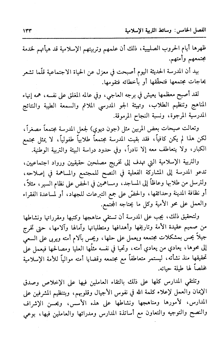 ولتحقق ذلك، يجب على المدرسة أن تستقي مناهجها وكتبها، ومقرراتها ونشاطها من صميم عقيدة الأمة وتاريخها، وأهدافها ومتطلباتها وآمالها وآلامها، حتى تخرج جيلا يحس بمشكلات مجتمعه، ويعمل على حلها، ويحس بآلام أمته ويربى على السعي إلى محوها، يعادي من يعادي أمته، وتحيا في نفسه مثلها العليا، ومصالحها فيعمل على تحقيقها منذ نشأته، ليستمر متعاطفًا مع مجتمعه وقضايا أمته مواليا للأمة الإسلامية مخلصًا لها طيلة حياته.