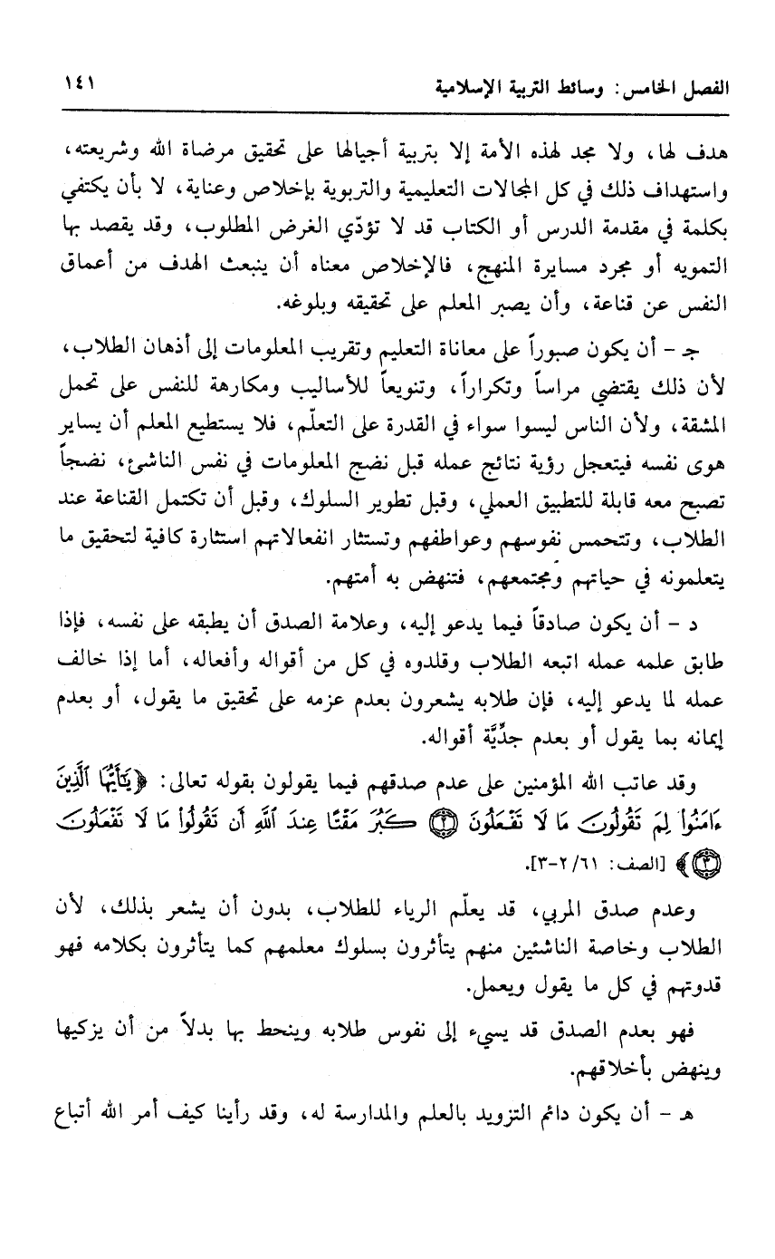 د- أن يكون صادقا فيما يدعو إليه، وعلامة الصدق أن يطبقه على نفسه، فإذا طابق علمه عمله اتبعه الطلاب، وقلدوه في كل من أقواله وأفعاله، أما إذا خالف عمله لما يدعو إليه، فإن طلابه يشعرون بعدم عزمه على تحقيق ما يقول، أو بعدم إيمانه بما يقول، أو بعدم جدية أقواله.