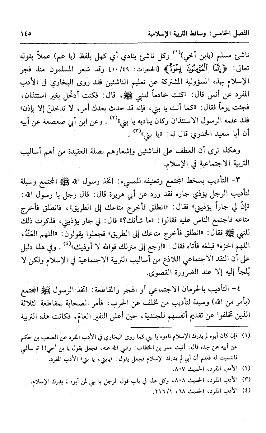 ناشئ مسلم "يا بن أخي"1، وكل ناشئ ينادي أي كهل بلفظ "يا عم" عملًا بقوله تعالى: {إِنَّمَا الْمُؤْمِنُونَ إِخْوَة} [الحجرات: 49/ 10] ، وقد شعر المسلمون منذ فجر الإسلام بهذه المسئولية المشتركة عن تعليم الناشئين، فقد روى البخاري في الأدب المفرد عن أنس قال: "كنت خادمًا للنبي صلى الله عليه وسلم، قال: فكنت أدخل بغير استئذان، فجئت يوما، فقال: "كما أنت يا بني، فإنه قد حدث بعدك أمر، لا تدخلن إلا بإذن"، فقد علمه الرسول الاستئذان، وكان يناديه يا بني"2، وعن ابن أبي صعصعة عن أبيه أن أبا سعيد الخدري قال له: "يا بني"3.