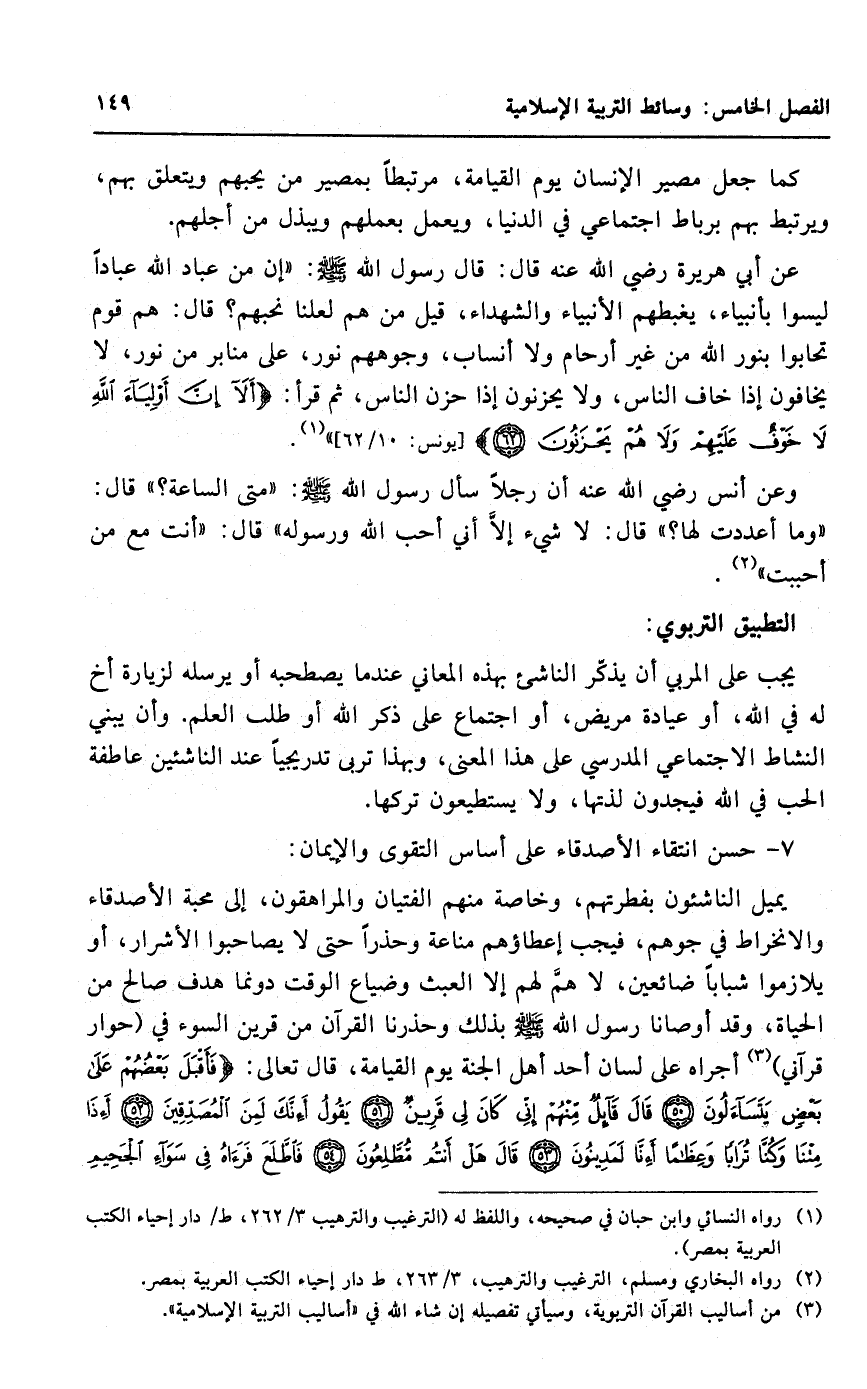 يجب على المربي أن يذكر الناشئ بهذه المعاني عندما يصطحبه، أو يرسله لزيارة أخ له في الله، أو عيادة مريض، أو اجتماع على ذكر الله أو طلب العلم، وأن يبني النشاط الاجتماعي المدرسي على هذا المعنى، وبهذا تربى تدريجيا عند الناشئين عاطفة الحب في الله فيجدون لذتها، ولا يستطيعون تركها.