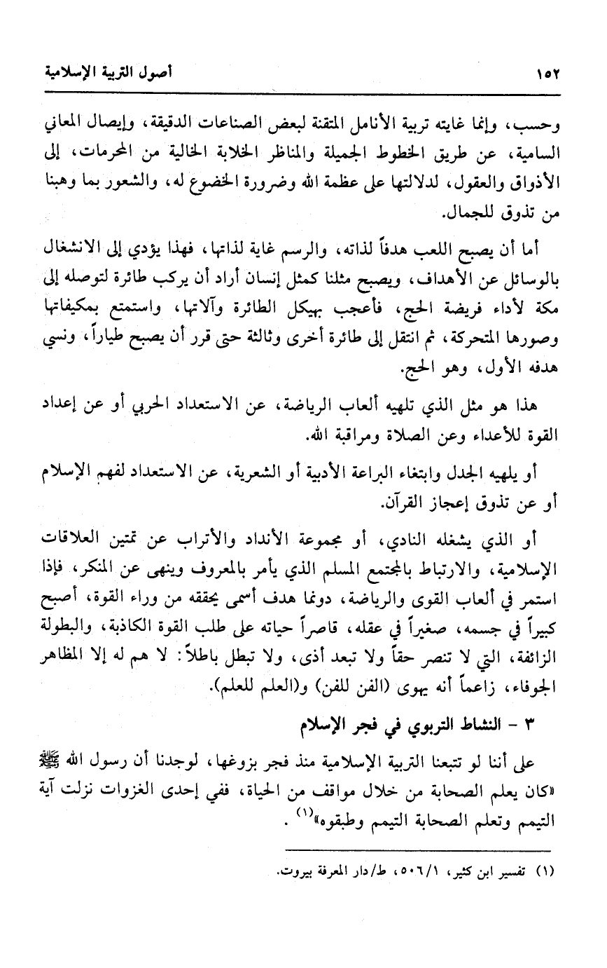 أو الذي يشغله النادي، أو مجموعة الأنداد، والأتراب عن تمتين العلاقات الإسلامية، والارتباط بالمجتمع المسلم الذي يأمر بالمعروف وينهى عن المنكر، فإذا استمر في ألعاب القوى والرياضة، دونما هدف أسمى يحققه من وراء القوة، أصبح كبيرا في جسمه، صغيرا في عقله، قاصرا حياته على طلب القوة الكاذبة، والبطولة الزائفة، التي لا تنصر حقا ولا تبعد أذى، ولا تبطل باطلًا: لا هم له إلا المظاهر الجوفاء، زاعمًا أن يهوى "الفن للفن" و"العلم للعلم".