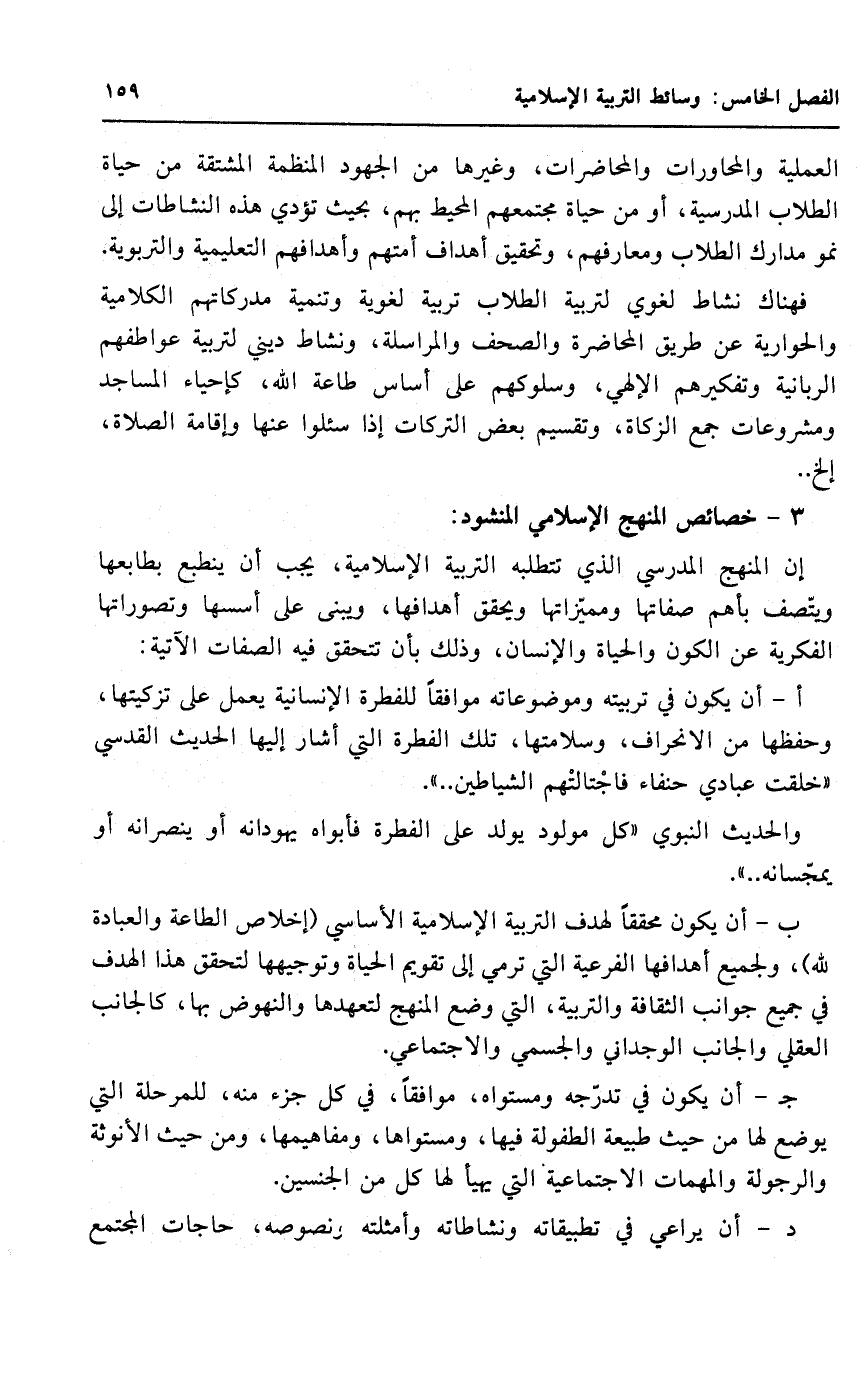ب- أن يكون محققا لهدف التربية الإسلامية الأساسي "إخلاص الطاعة والعبادة لله"، ولجميع أهدافها الفرعية التي ترمي إلى تقويم الحياة، وتوجيهها لتحقق هذا الهدف في جميع جوانب الثقافة والتربية، التي وضع المنهج لتعهدها والنهوض بها، كالجانب العقلي والجانب الوجداني والجسمي، والاجتماعي.